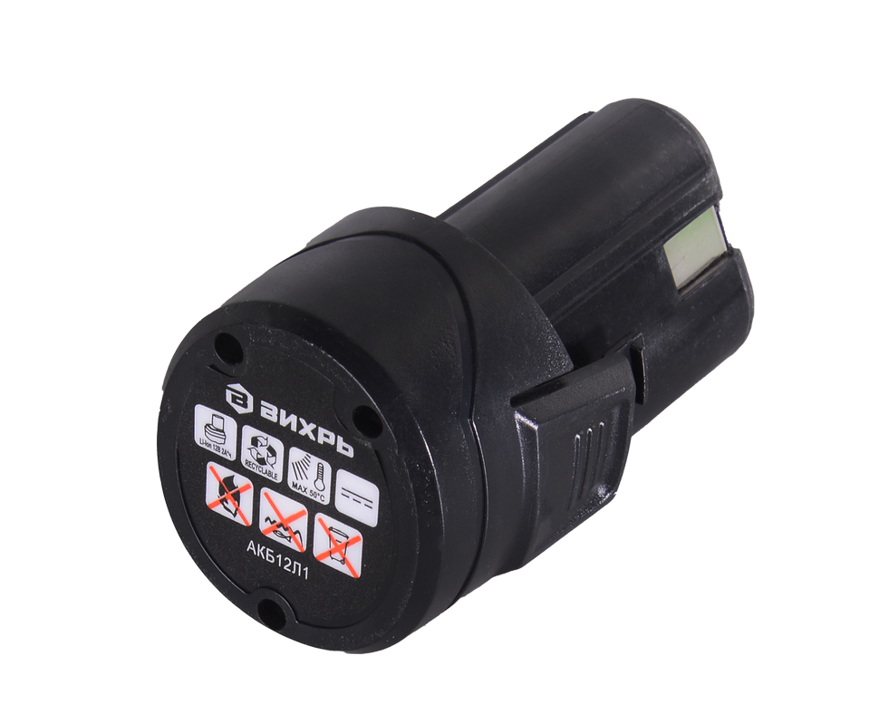 Литий-ионный аккумулятор Вихрь АКБ12Л1 KP для шуруповерта Вихрь ДА-12Л-2К типа обойма. Быстро устанавливается на шуруповерт одним движением. Напряжение аккумулятора - 12 В, емкость составляет 2 А*ч.