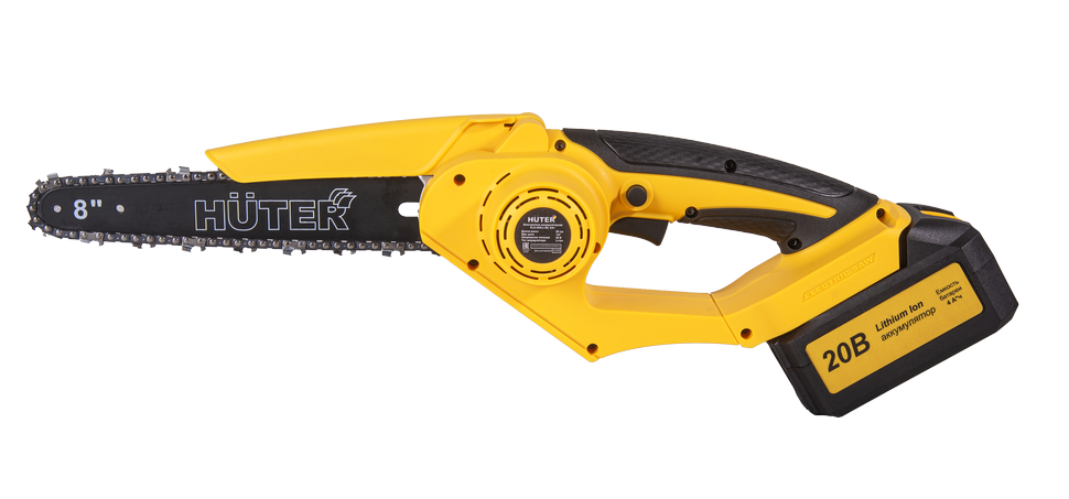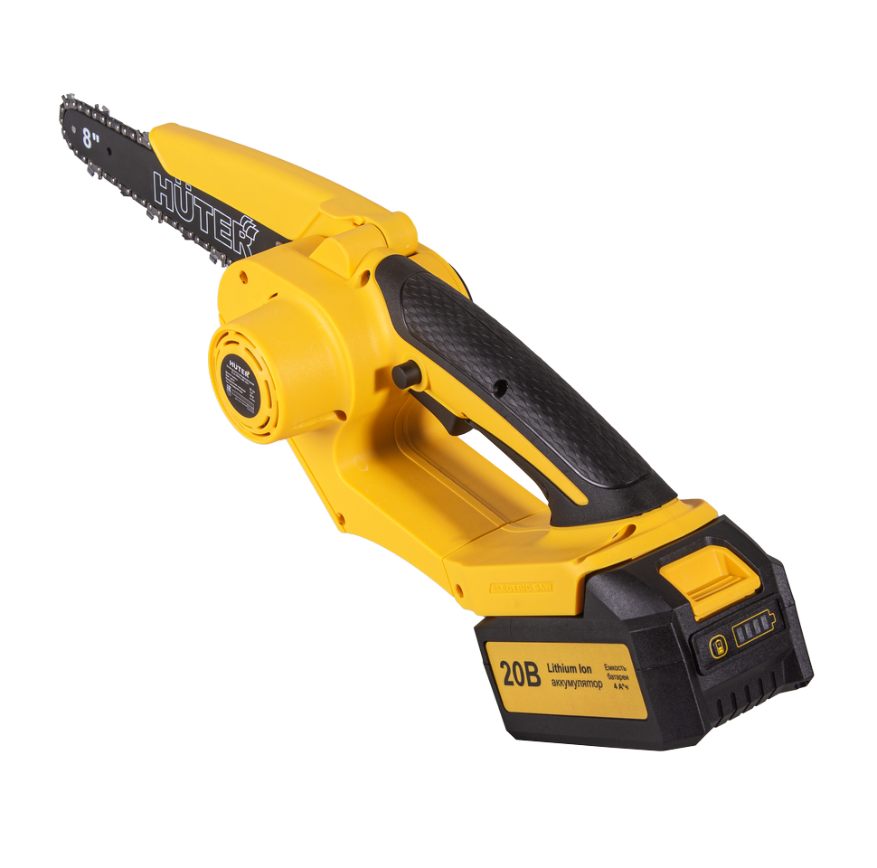 Система цепи включает 45 звеньев с шагом 1/4, что гарантирует плавный рез и высокую точность. Компактные габариты и легкий вес способствуют комфорту при использовании, а качественная сборка и продуманная эргономика Huter ELS-20/8-Li-BL позволяют длительно удерживать инструмент без усталости.