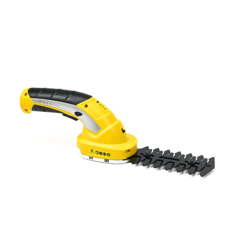 Корпус аккумуляторного кустореза выполнен в виде овальной платформы с наклонной эргономичной ручкой. Платформа снабжена крышкой с фиксатором, под которую прочно крепится необходимое для работы лезвие. Рукоятка с резиновыми накладками исключает проскальзывание руки во время работы. Триммер-кусторез обладает небольшим весом - всего 1 кг.