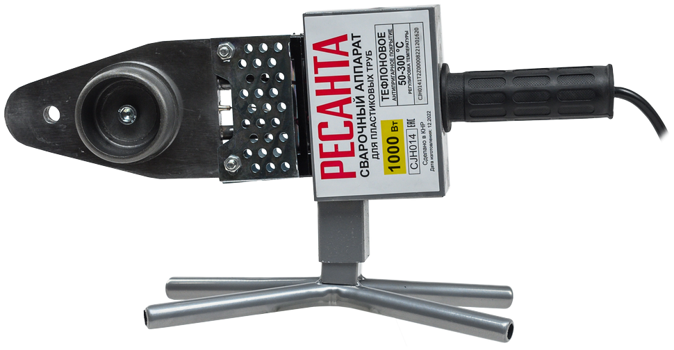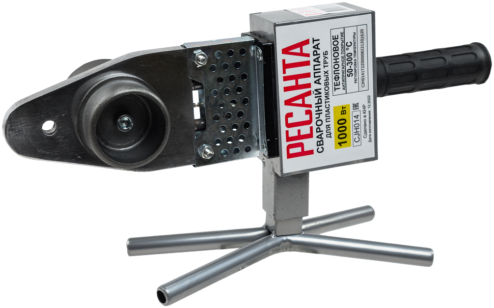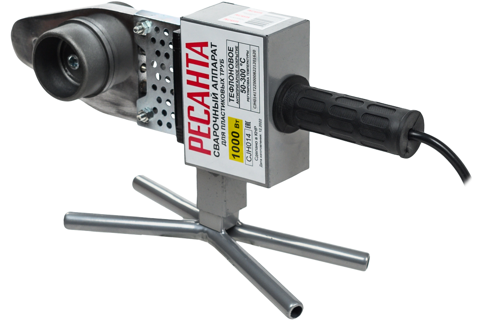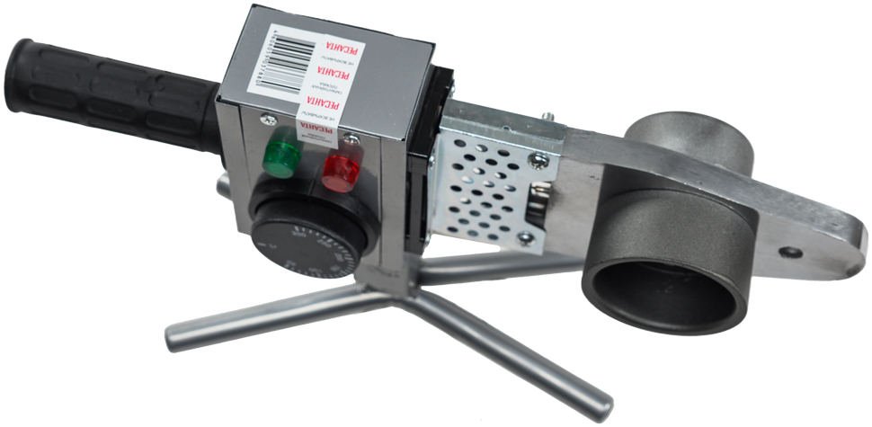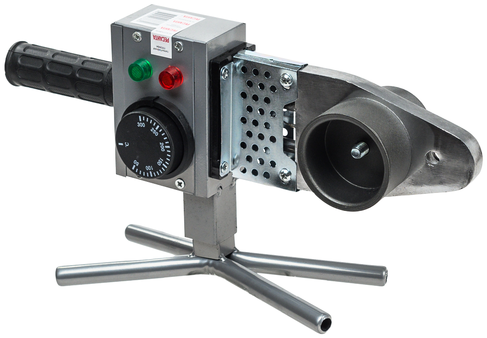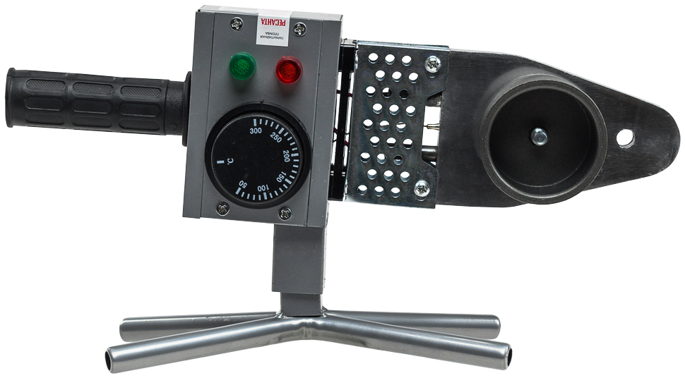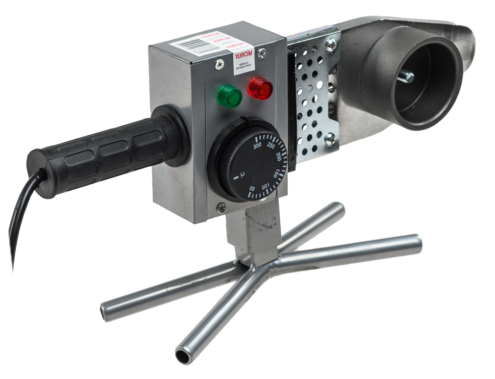 Устройство мощностью 1000 Вт используется для фиксации водопроводных, отопительных труб из пластика между собой раструбной сваркой, которая позволяет добиться надежности и герметичности конструкции. Благодаря мощному нагревательному элементу, АСПТ быстро нагревается до необходимой температуры. За счет автоматического термостата поддерживается оптимальный температурный режим. При достижении заданной температуры (в пределах от 0 до +300 градусов) термостат отключает электропитание, в случае остывания насадок нагрев возобновляется. В комплектацию сварочного аппарата для пластиковых труб входят 6 парных насадок популярных размеров (20-63 мм). Они покрыты тефлоновым слоем, что исключает налипание пластика. Устройство оснащено быстросъемной подножкой, но из-за малого веса может использоваться и без опоры. Аппарат и все насадки уложены в кейс, наличие которого упрощает хранение и переноску.