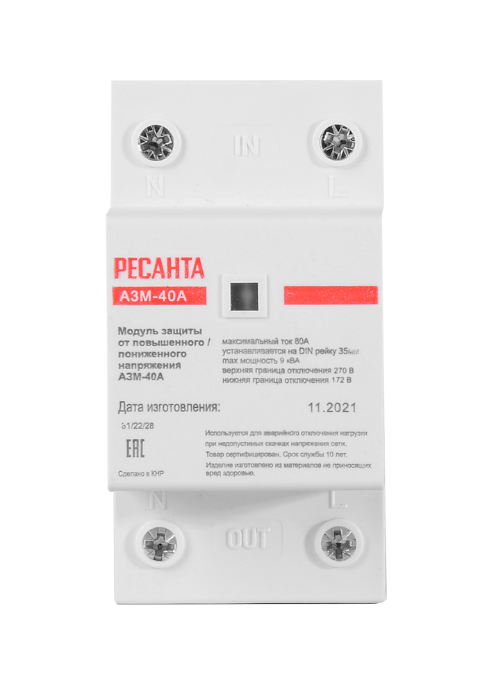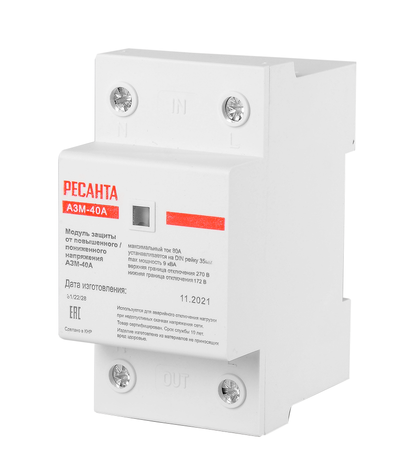 Автоматический защитный модуль от повышенного/пониженного напряжения Ресанта АЗМ-40A используется для аварийного отключения нагрузки при недопустимых скачках напряжения сети. Верхняя граница отключения: 270 В, нижняя граница отключения: 172 В. Время воздействия: при понижении напряжения 0.8 с, при повышении напряжения 0.2-0.5 с.