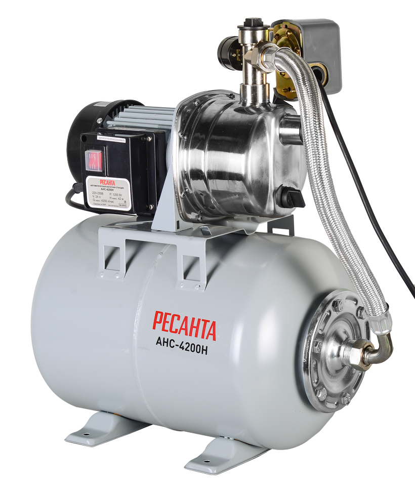 Автономная насосная станция включает весь необходимый для водоподведения набор узлов в сборе. В состав Ресанта АНС-4200Н входят насос, гидроаккумулятор на 24 л, а также реле с защитой от перегрева и «сухого» хода. Накопительный бак снабжен ножками для крепления к поверхности. Фиксация снижает вибрацию и шум во время работы. Двигатель мощностью 1200 Вт заключен в корпус из нержавеющей стали. Для продления ресурса рабочих узлов количество включений АНС ограничено 20 стартами в час.