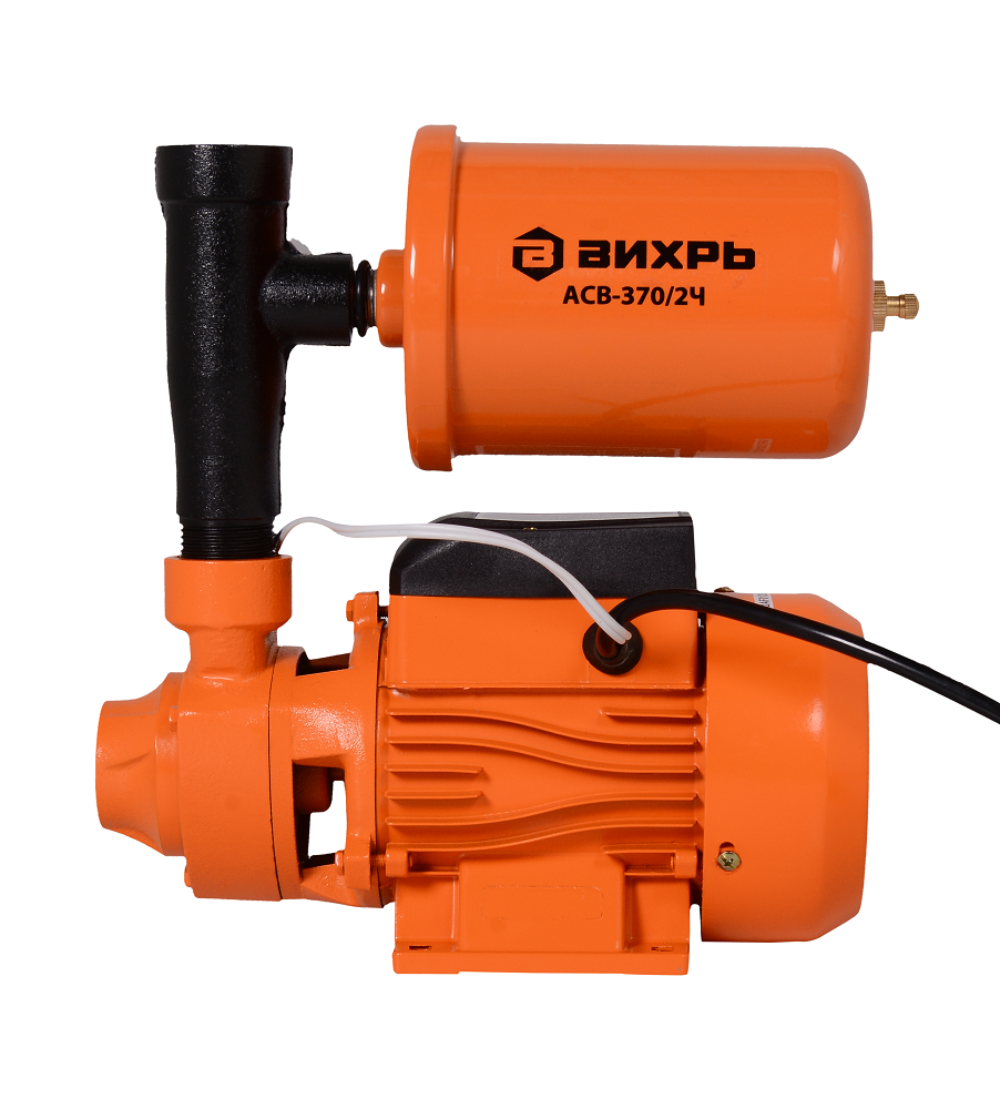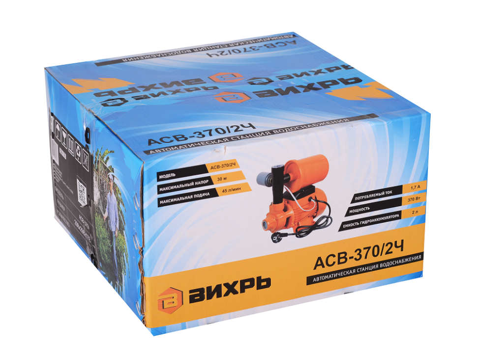 Вихрь АСВ 370/2Ч – бюджетная модель автономной станции водоснабжения с электронасосом поверхностного типа 370Вт, гидроаккумулятором и реле давления. Она способна подавать воду объёмом до 45л/мин с напором до 30м. Глубина всасывания составляет до 9 м. Постоянный напор в системе поддерживается за счёт реле давления, которое производит включение электронасоса при падении давления до минимальных значений и выключение – при достижении необходимого давления. Станция рассчитана максимально на 20 включений в час.