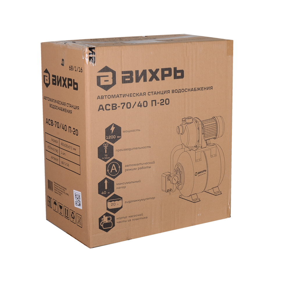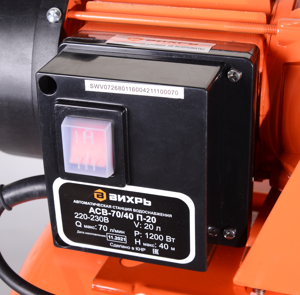 Вихрь АСВ 70/40 П-20 относится к категории современных автономных станций водоснабжения. Основная функция аппарата заключается в автоматическом бесперебойном водоснабжении в собственном доме, на дачном участке или других загородных пространствах. Поддержка уровня давления при подаче воды происходит автономно. Включение и отключение при расходе воды потребителем происходит на автомате, рассчитан не более чем 20 включений в час. В данной моделей максимальный напор - 40 м. Подача на максимум – 70 л/мин.
