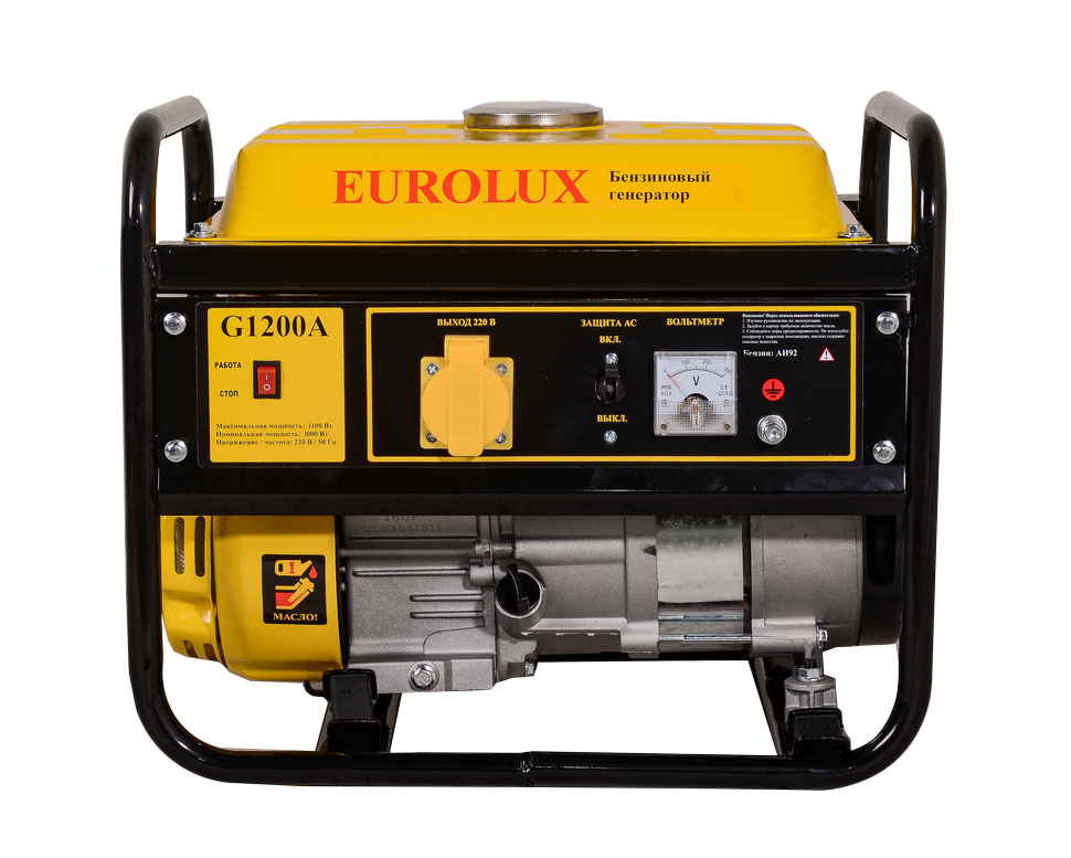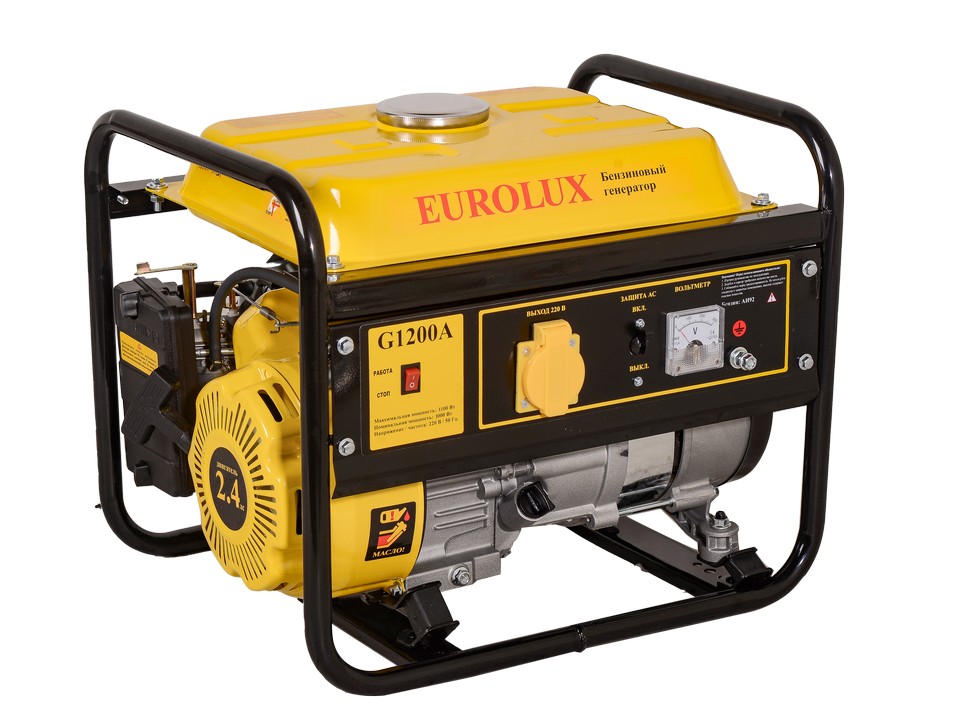 Электрогенератор EUROLUX G1200A используется в целях подключения бытовых устройств к сети на объектах без доступа к ней. Можно считать его как основным, так и запасным источником электропитания, функционирующим на неэтилированном бензине АИ-92.