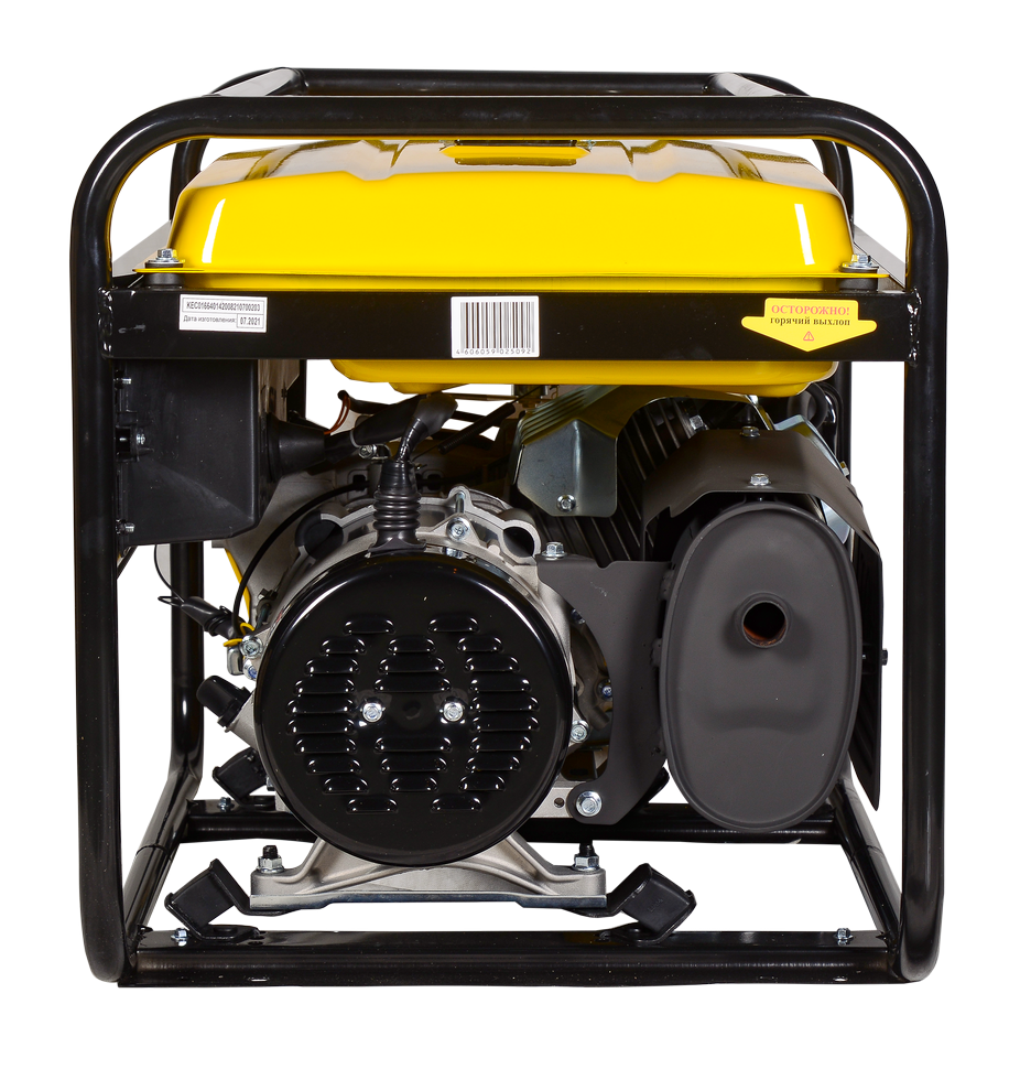 Бензогенератор встроен в прочную несущую раму из круглой трубы, для снижения вибрации предназначены резиновые опоры, бак для топлива расположен сверху. На передней стороне расположены кнопка пуска, вольтметр, тумблер включения защиты от КЗ, 2 розетки для подключения приборов-потребителей.