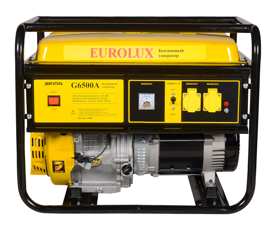 EUROLUX G6500A – передвижной бензиновый электрогенератор с ручным стартером, предназначенный для выработки электроэнергии в условиях, где невозможна ее магистральная подача. Модель рассчитана на автономное электроснабжение дач, загородных домов, строительных и эксплуатационных площадок.