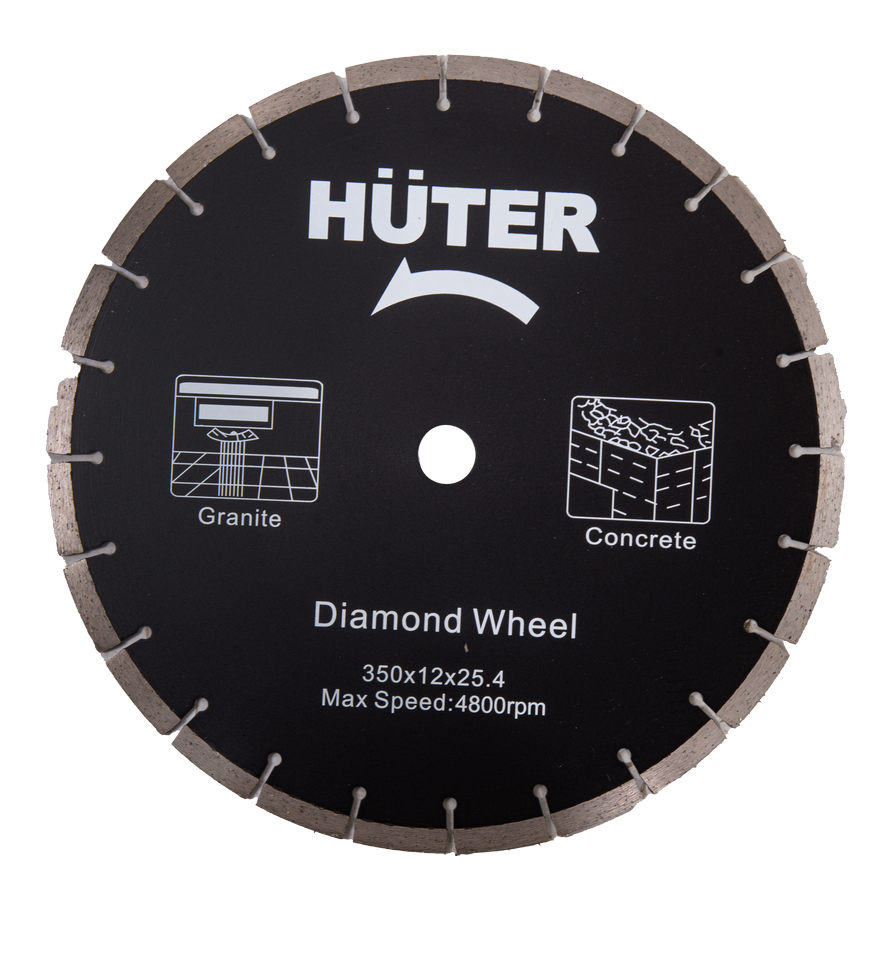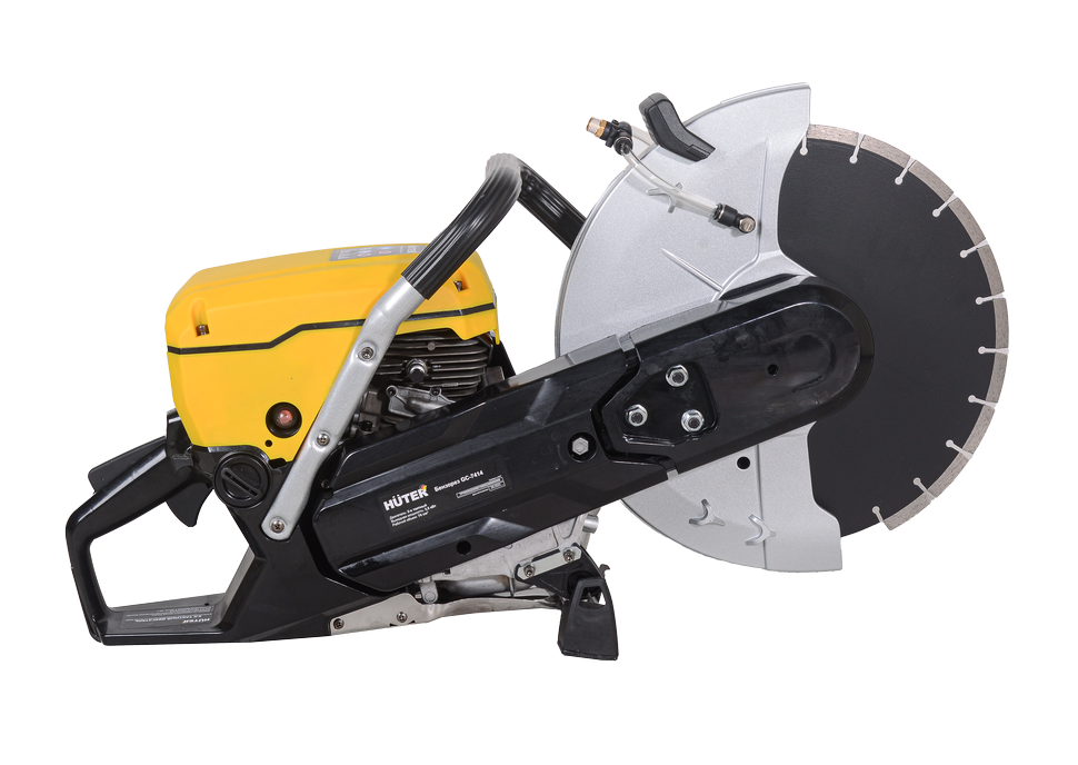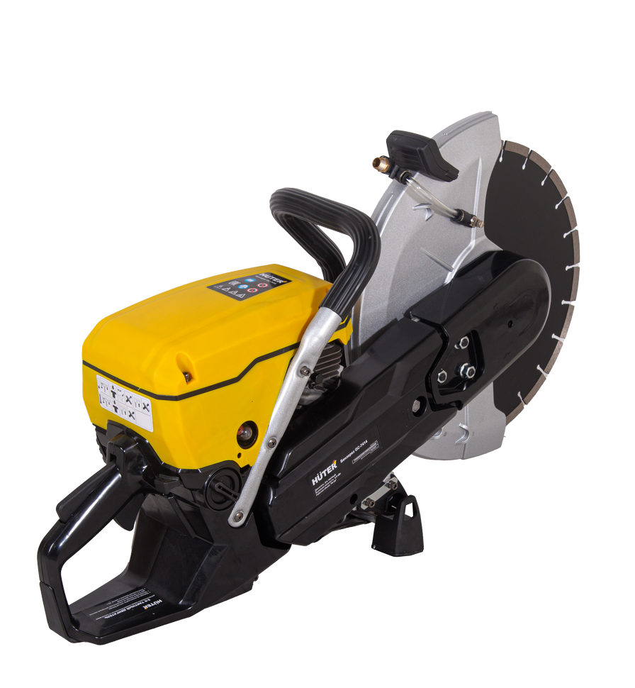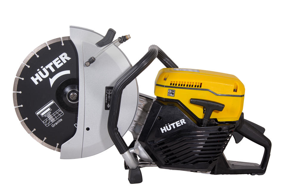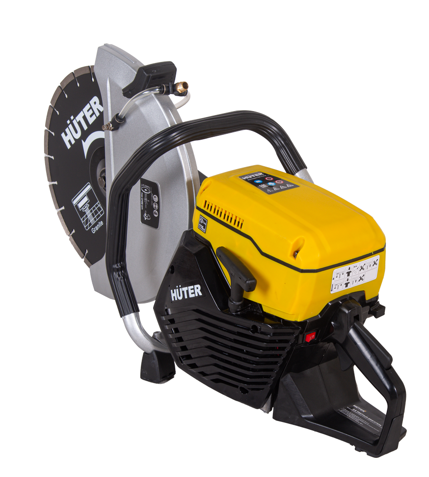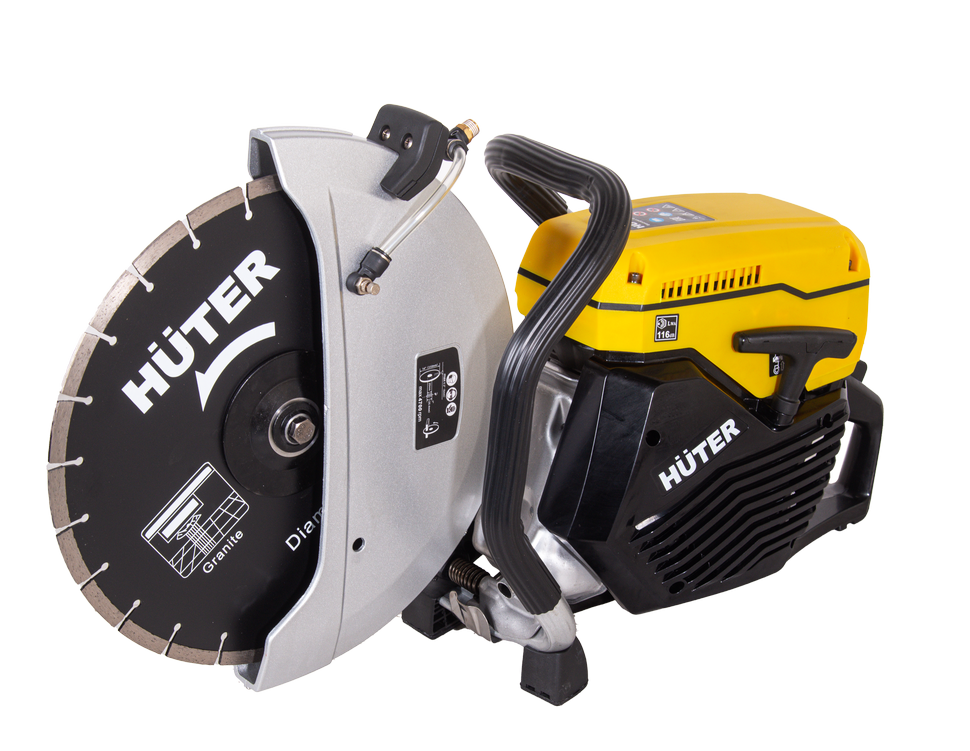 Объем двигателя 74 см³ обеспечивает высокий крутящий момент. Максимальная скорость вращения диска составляет 4700 об/мин. Втулка универсального размера позволяет использовать режущие элементы с посадочным отверстием 20 и 25,4 мм. Диаметр используемых дисков может достигать 350 мм, что обеспечивает разрезы глубиной до 125 мм. Это позволяет проводить монтажные и демонтажные работы, нарезать штробы, дверные проемы, бетон, кирпичную кладку и асфальт. Система подачи воды с универсальным штуцером обеспечивает возможность влажной резки.