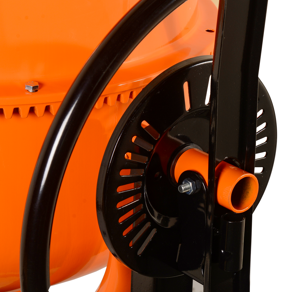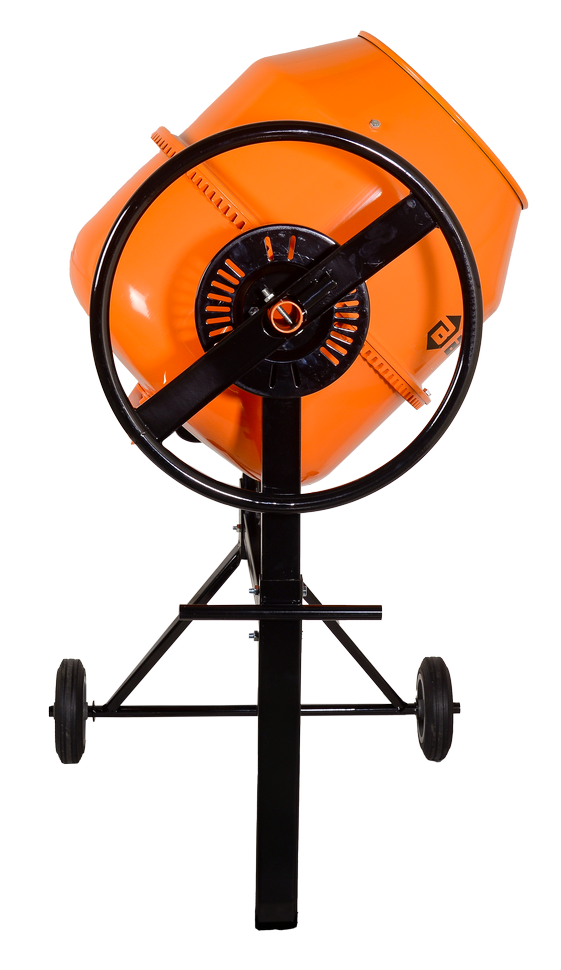 Электробетономешалка запитывается от бытовой электросети. Двигатель мощностью 450 Вт обеспечивает вращение барабана со скоростью 32 об/мин. Его объем 120 л. В зависимости от закладываемых материалов допустимо заполнять барабан на 50-70% от номинального объема. Диаметр отверстия для закладки в 402 мм позволяет комфортно загружать строительные материалы, а штурвал – выгружать приготовленные раствор или смесь.