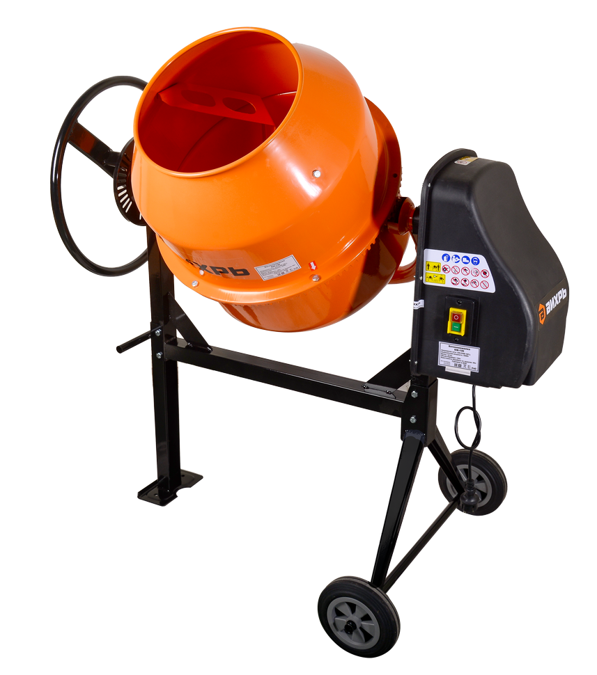 Отверстие барабана составляет 402 мм, что обеспечивает удобную и быструю загрузку цементной смеси. Данная модель причисляется к электробетономешалкам гравитационного типа, за счет вращения барабанной части, а не лопастей. Скорость вращения барабана 32 об/мин позволяет добиться ровной, однородной массы. Конструкция продумана и безопасна: