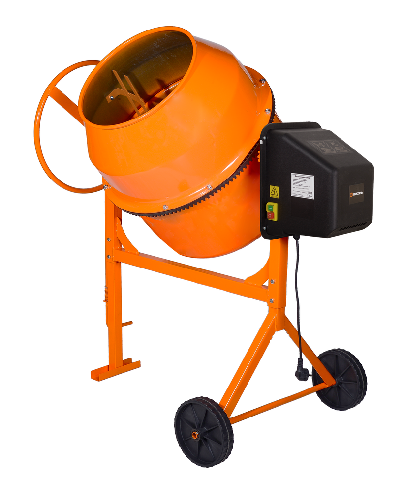 Агрегат имеет прочную устойчивую конструкцию и работает по гравитационному принципу. На внутренних стенках барабана расположены неподвижные лопасти, благодаря которым происходит активное перемешивание компонентов во время вращения бака. Объем барабана составляет 180 л, отверстие равно 407 мм. Скорость вращения (32 об./мин) является оптимальной для быстрого и качественного замеса. Выгрузка готового раствора и другие действия с барабаном облегчены за счет наличия в конструкции удобного поворотного штурвала. Одним из преимуществ бетономешалки является использование полиамидного венца. Он не уступает чугуну по прочности и исключает проскальзывание зубцов. Полиамидный венец отличается меньшим весом и бесшумной работой. Для удобства передвижения на опоре имеются 2 больших прочных колеса. При отключении электропитания пускатель обеспечивает защиту от повторного включения двигателя.