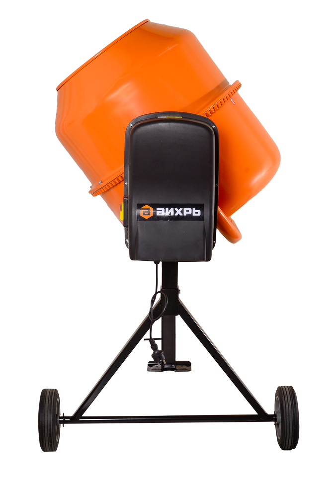 Электробетономешалка Вихрь БМ-205 гравитационного типа. Барабан вращается со скоростью 32 об/мин. Лопасти внутри емкости остаются неподвижными и перемешивают раствор. Допустимо закладывать заполнители размером не более 40 мм. Для удобства добавления стройматериалов у модели Вихрь БМ-20АЧ увеличенное отверстие бака диаметром 407 мм.