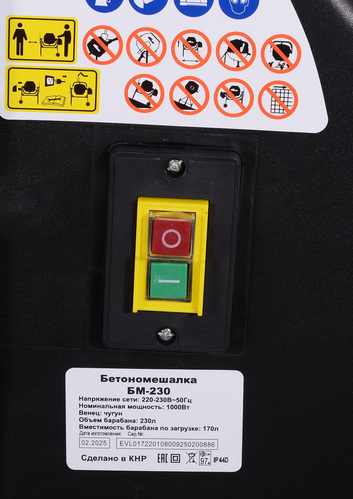 Мощность этой модели электрической бетономешалки составляет 1000 Вт. Объём барабана – 230 л. Скорость вращения – 32 об/мин. Диаметр отверстия для загрузки-выгрузки – 407 мм. Венец модели БМ-230 выполнен из высококачественного чугуна. Бетономешалка имеет удобное поворотное колесо, позволяющее быстро выгружать растворы или сухие смеси, а также высокопрочные колёса для перемещения агрегата по территории стройплощадки. Для исключения несанкционированных повторных пусков агрегата после отключений электроэнергии эта модель оснащена защитой. Вес электробетономешалки – 60 кг. Работает от питающей электросети 220 В, 50 Гц.