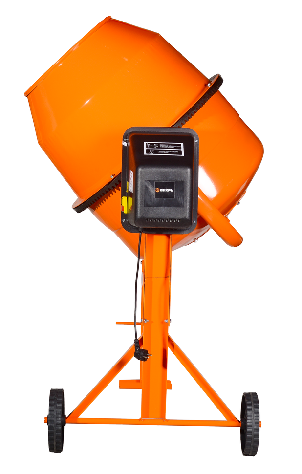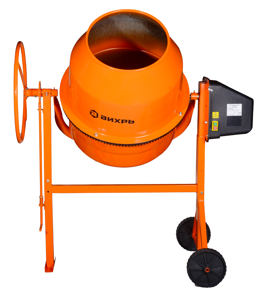 Электробетономешалка Вихрь БМ-230П имеет простую и надежную конструкцию. Штурвальное устройство отличается удобством выгрузки готовых смесей. Широкое отверстие диаметром 407 мм позволяет извлекать раствор путем опрокидывания бака. Яркий оттенок корпуса соответствует требованиям СНиП. Наличие колес предусматривает транспортировку бетоносмесителя по строительной площадке. При отключении электропитания пускатель обеспечивает защиту от повторного включения двигателя.