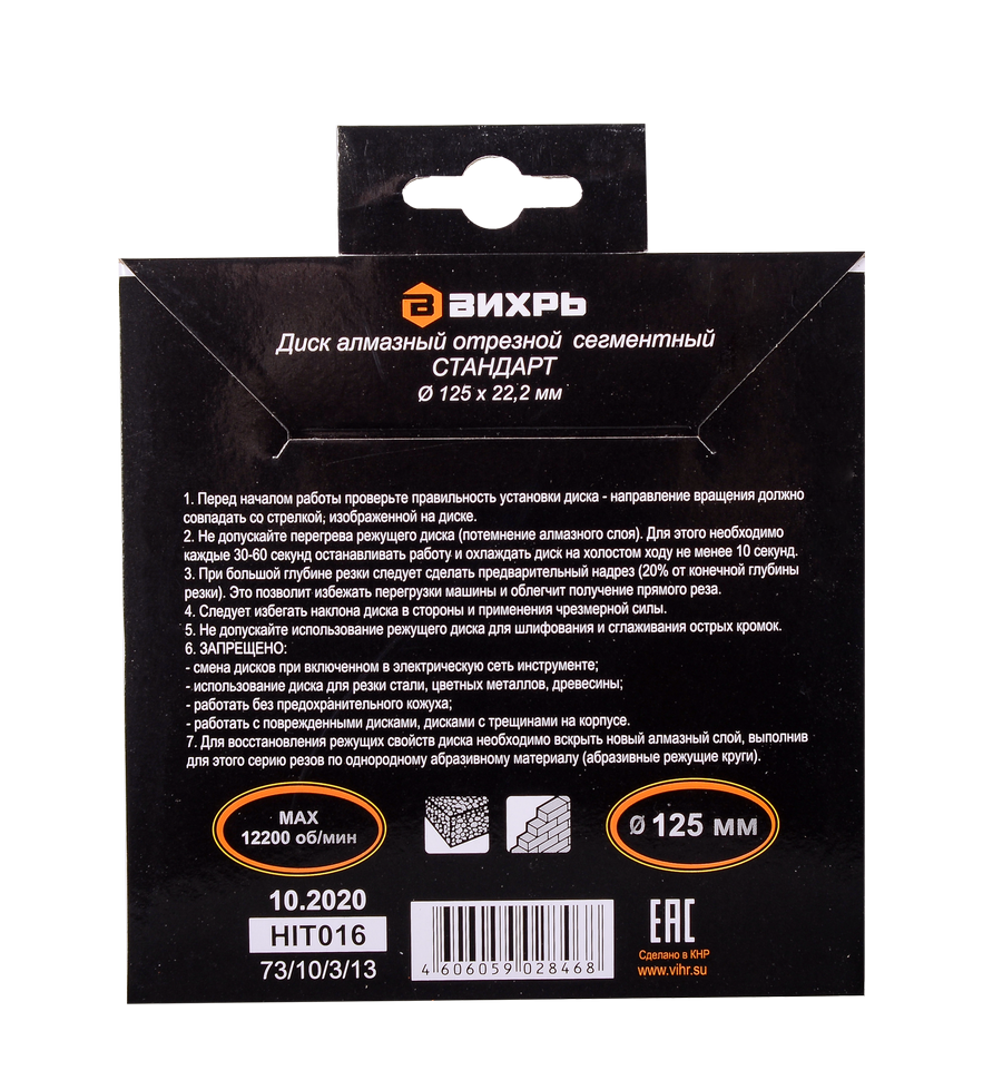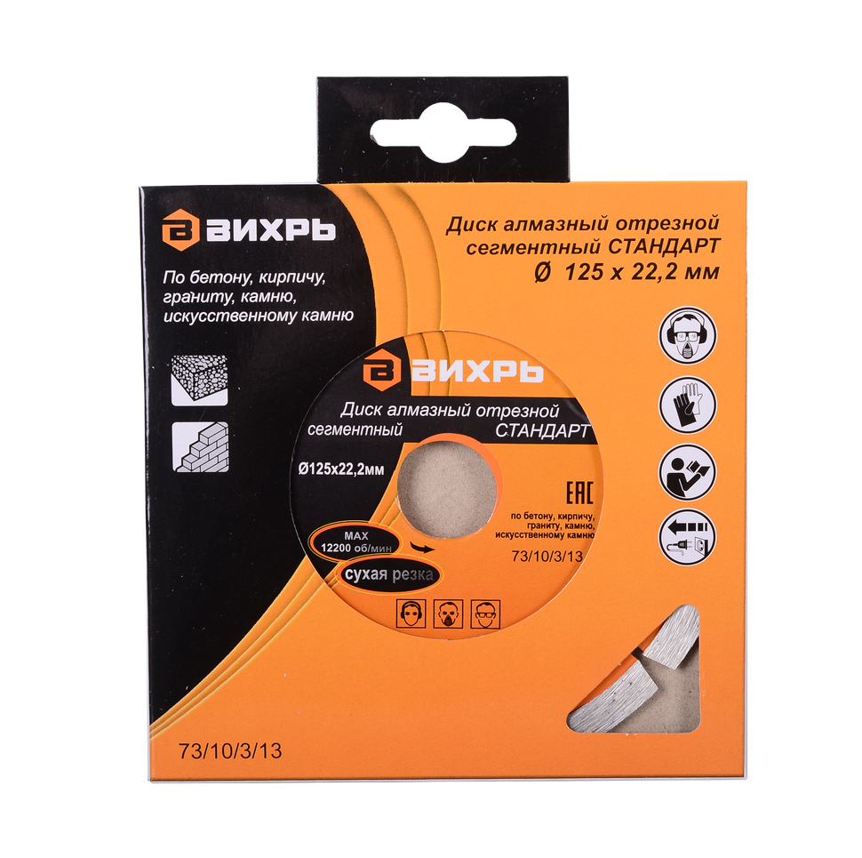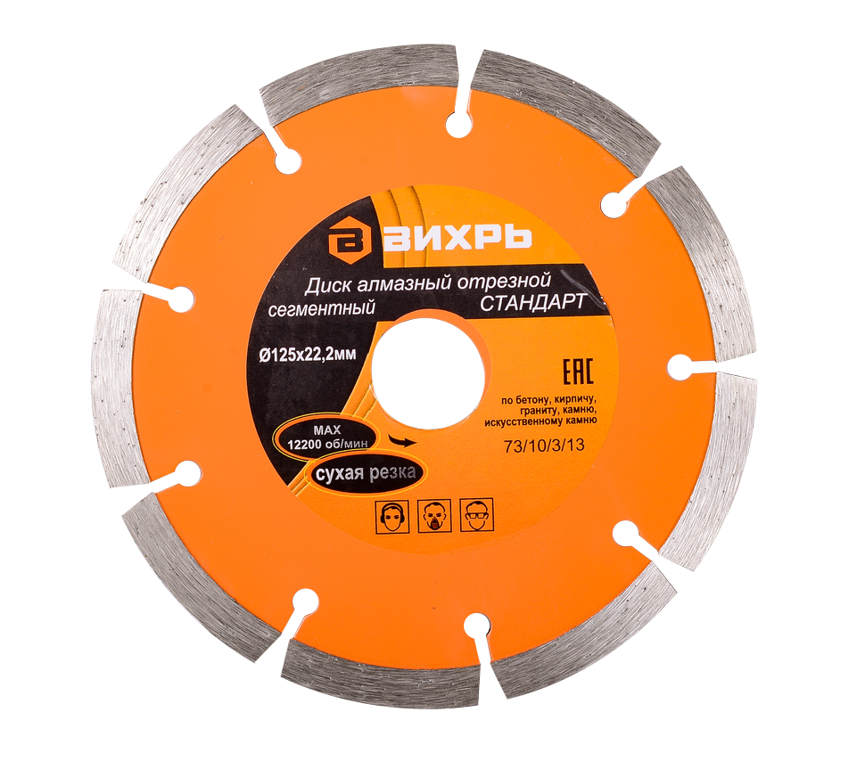 Отрезной диск Вихрь сегментный Стандарт предназначен для резки сухим методом изделий из твёрдых материалов: армированный бетон, кирпич, камень и т.д. Благодаря наличию "прорезей" сегментов в диске, процесс обработки осуществляется с эффективным выбросом продуктов резания. Максимальное число оборотов диска - 12 200 об/мин.