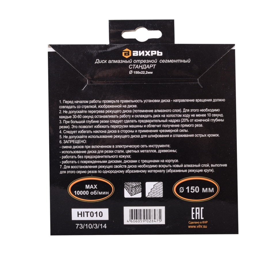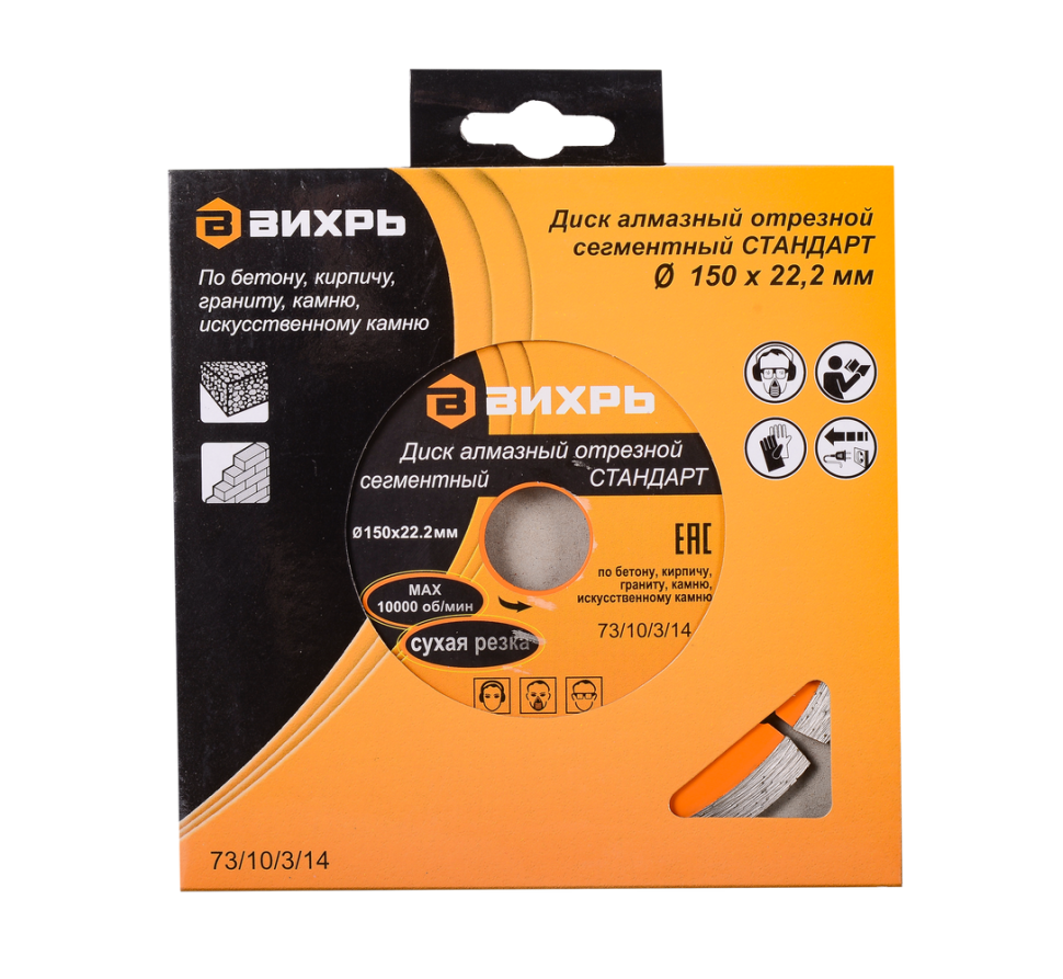 Диск алмазный сегментный 150мм х 22мм от бренда Вихрь – это надежный и эффективный инструмент для резки каменных и бетонных поверхностей. Этот диск имеет диаметр 150 мм и посадочный диаметр 22 мм, что позволяет использовать его с мощными угловыми шлифовальными машинами. Диск выполнен из качественного материала, что обеспечивает высокую скорость и точность резки. Максимальное число оборотов: 10 000 об/мин.