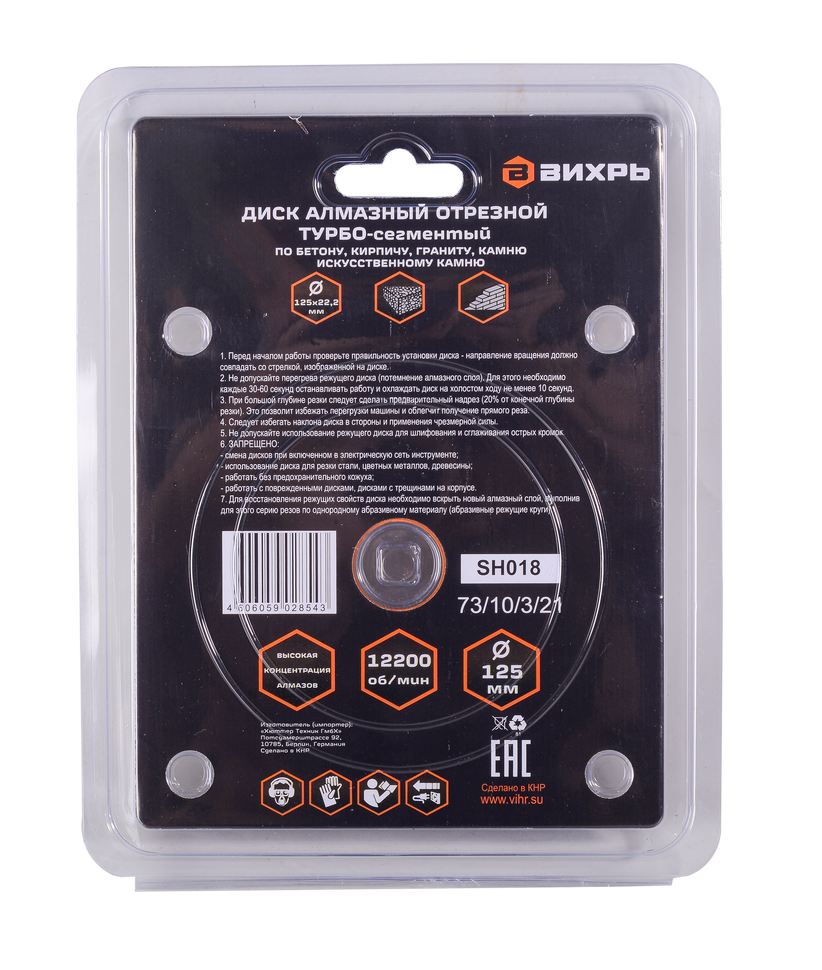 Данный диск имеет диаметр 125 мм и посадочный диаметр 22.2 мм. Способен выдерживать максимальные обороты до 12 200 об/мин. Благодаря использованию алмазного напыления, диск сохраняет свои отличные режущие свойства на протяжении долгого времени эксплуатации.