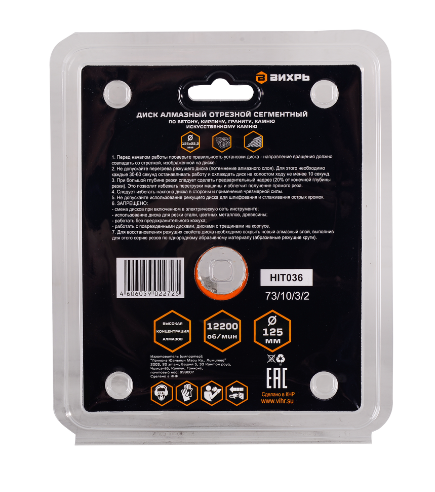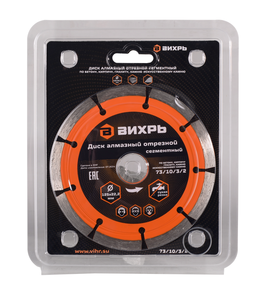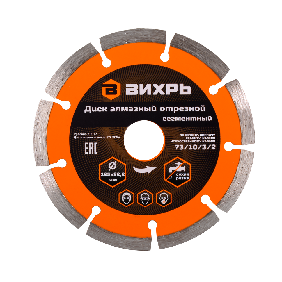 Диск алмазный 125x22,2 Вихрь - хороший выбор для тех, кто ищет надежную оснастку для резки таких твердых материалов как мрамор и гранит, бетон, камень, кирпич и шлакоблоки.