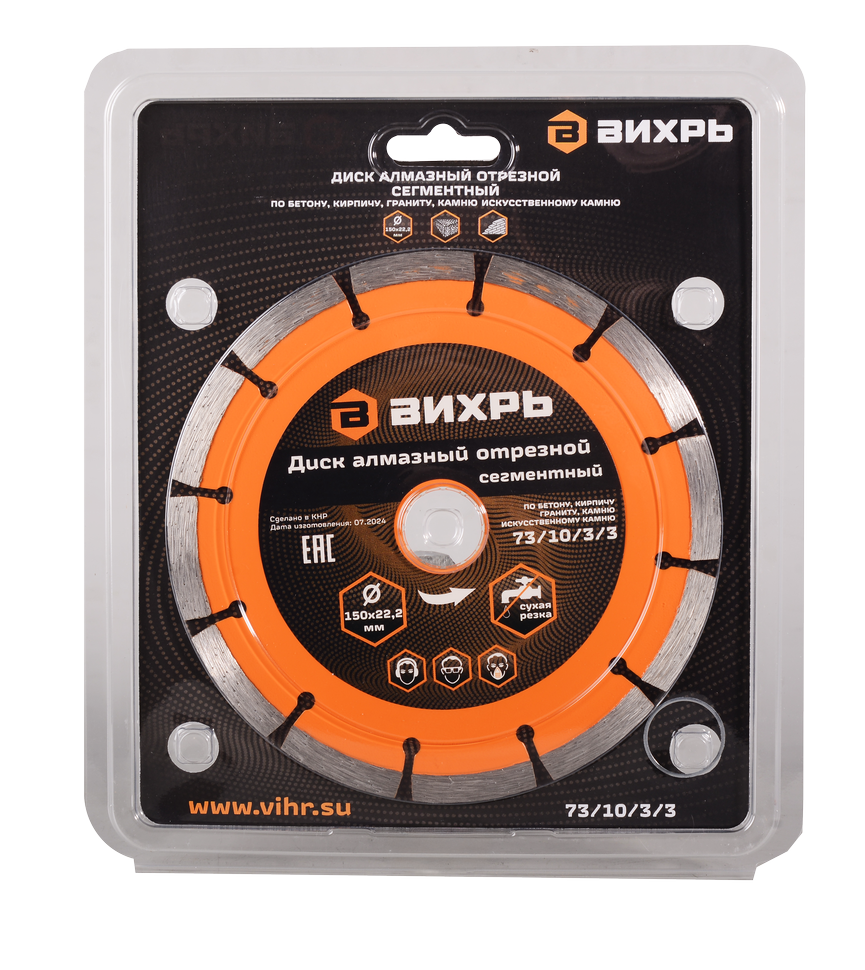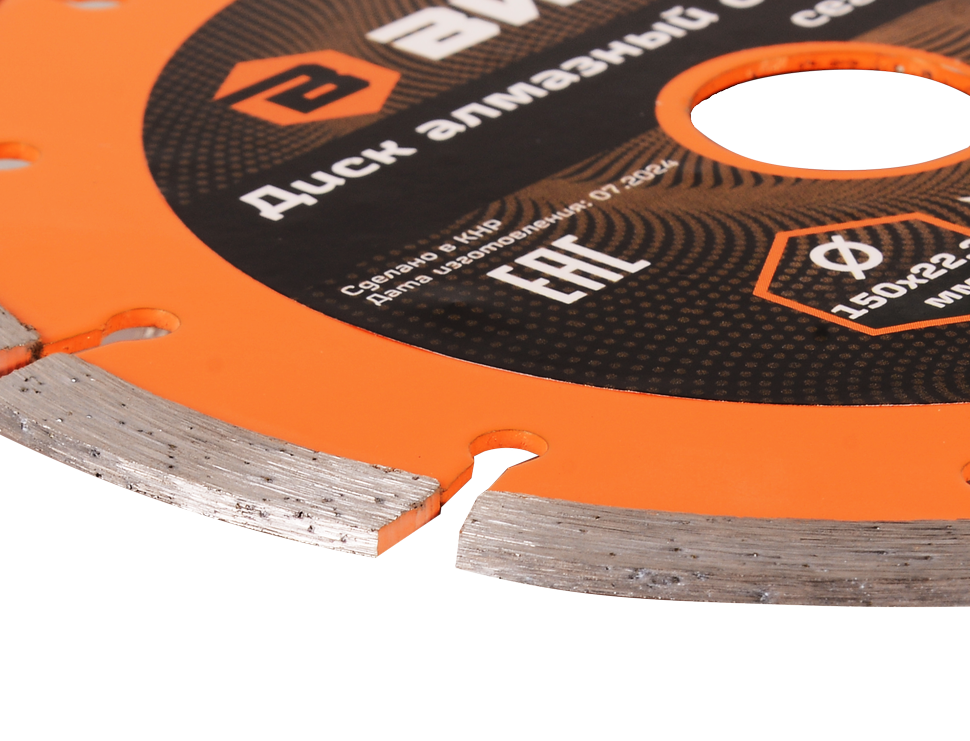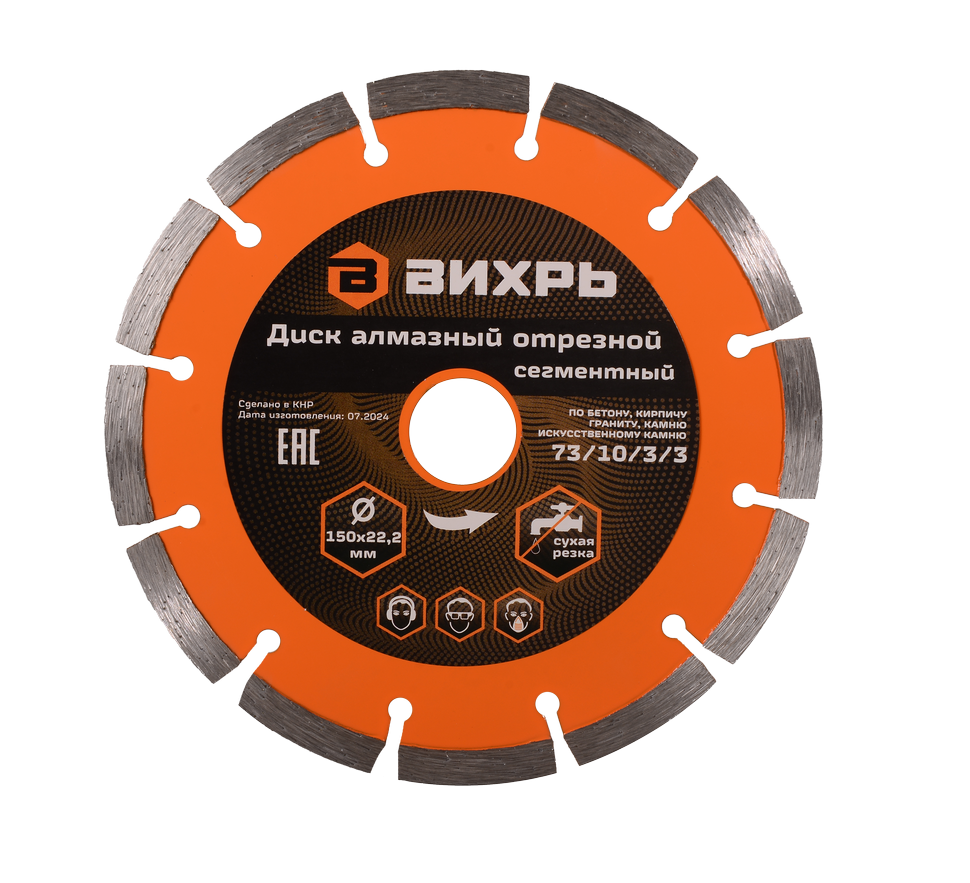 Диск алмазный отрезной сегментный Вихрь - это качественный отрезной диск для обработки кирпича, бетона и камня. Он имеет диаметр 150 мм и посадочное отверстие 22,2 мм. Диск оснащен сегментной конструкцией, что обеспечивает высокую скорость и эффективное удаление продуктов резки. Улучшено качество отрезного слоя и повышен рабочий ресурс.
