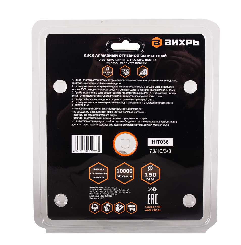 Диск Вихрь предназначен для сухой резки твердых материалов: камня, бетона, мрамора и гранита, кирпича и строительных блоков.