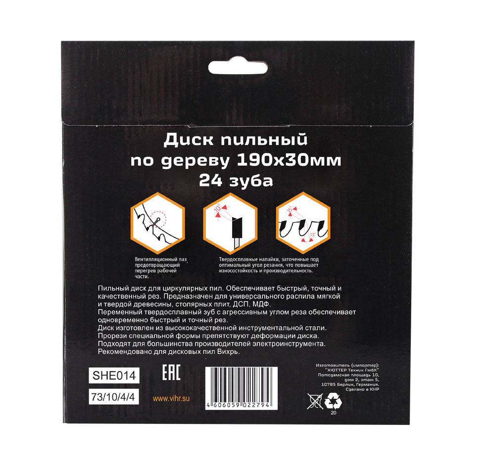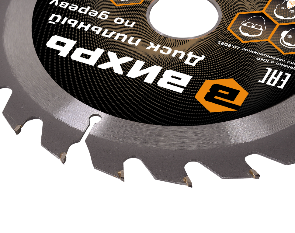 Диск оснащен 24 зубьями, которые имеют твердосплавные напайки, что обеспечивают быстрое и чистое резание древесины и долгий срок службы. Специальные прорези предназначены охлаждения тела диска во время работы.