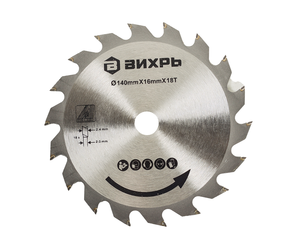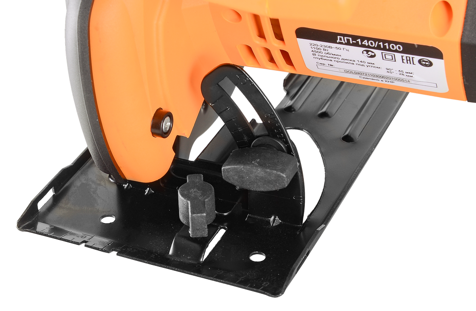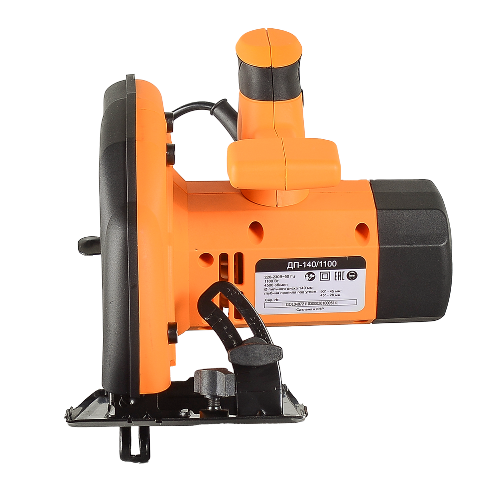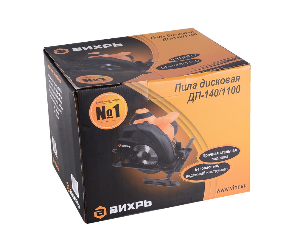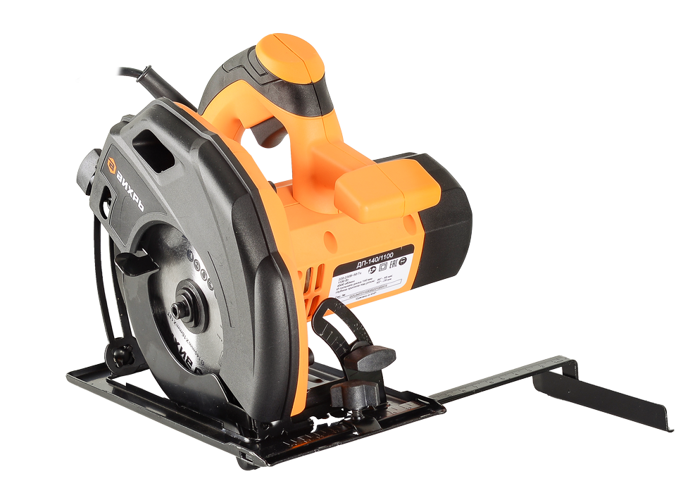 Модель циркулярной пилы оснащена электродвигателем 1.1 кВт, обеспечивающим вращение с частотой до 4500 об/мин. Диаметр посадочного отверстия для пильных дисков – 20 мм. Глубина распилов под углом 90° составляет 45 мм, а при угле 45° – 28 мм. Среди основных достоинств этой пилы можно выделить наличие верхнего кожуха для отведения отходов, а также нижнего, оснащённого возвратной пружиной. Инструмент имеет опорную плиту с возможностью регулировать угол пиления, систему регулирования глубины распила и крепёж параллельного упора. Питание Вихрь ДП-140/1100 осуществляется от сети 220В, 50Гц.
