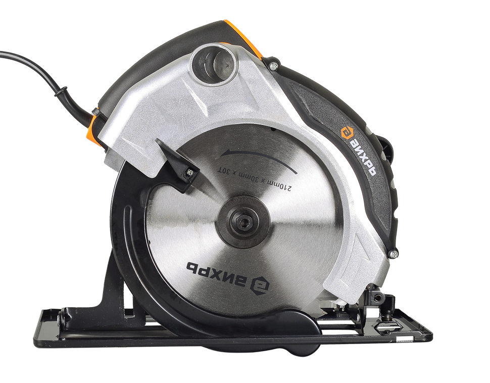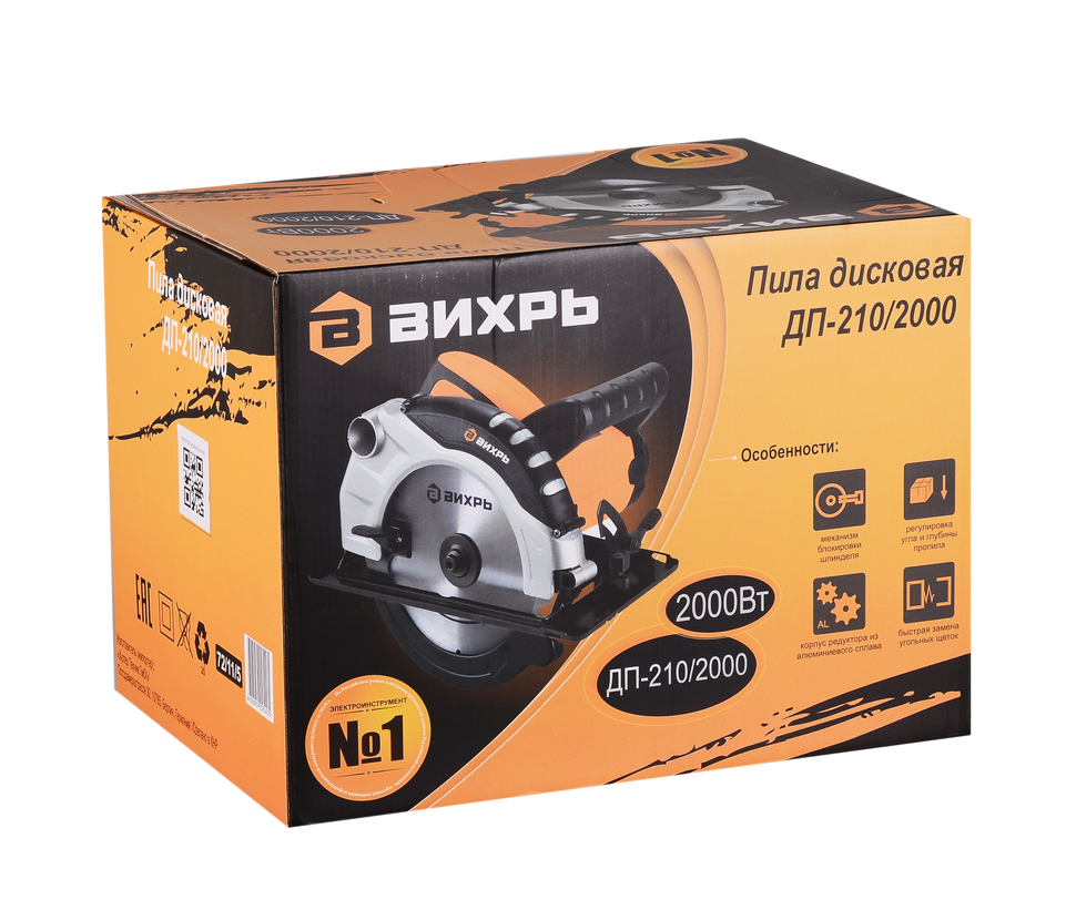 На Вихрь ДП-210/2000 устанавливаются пильные диски диаметром 210 мм, а диаметр посадочного отверстия диска составляет 30 мм. При мощности двигателя 2000 Вт скорость вращения вала доходит до 5500 об/мин. Для безопасной эксплуатации дисковая пила оснащена защитными кожухами. Нижний кожух маятникового типа обнажает рабочие части пилы только во время контакта с заготовкой. Верхний закрывает диск от случайного касания и предотвращает разлет стружки и пыли. К отверстию для их отвода можно подключить строительный пылесос.