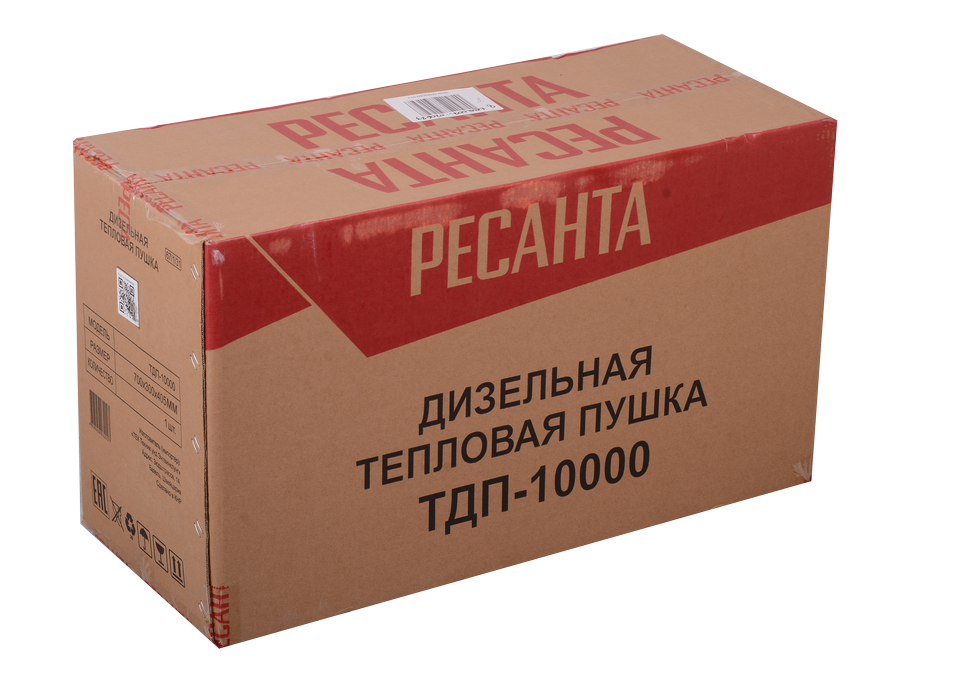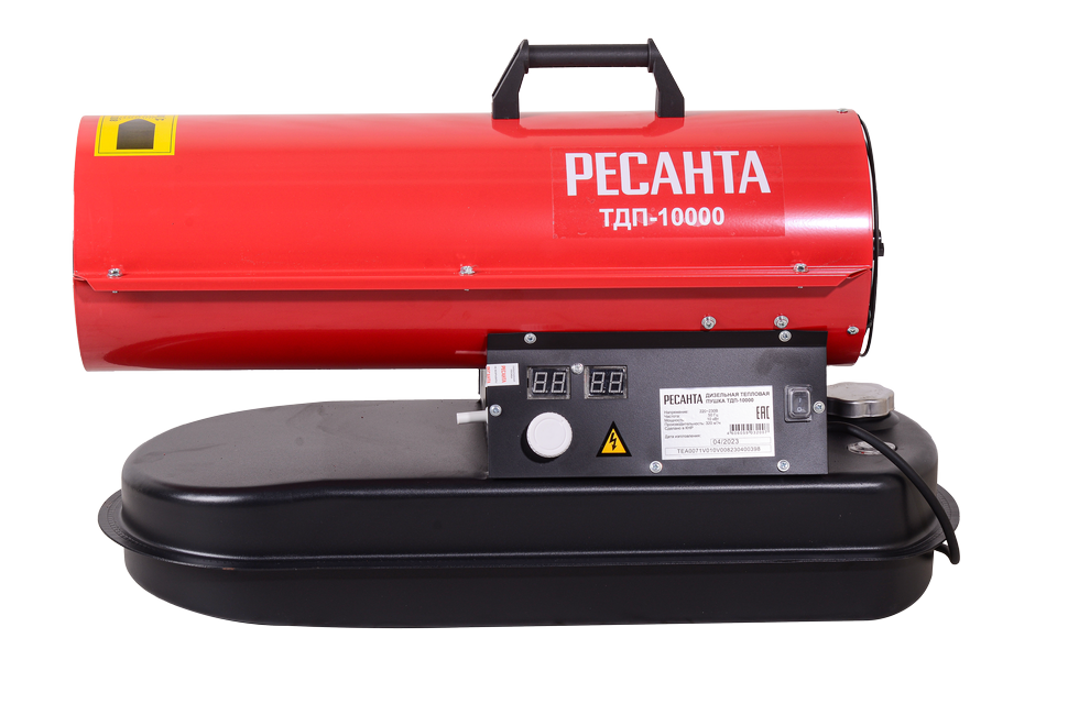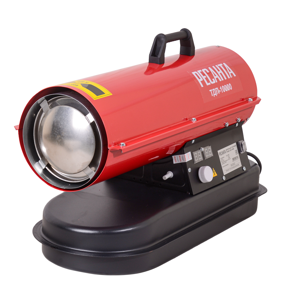 Ресанта ТДП-10000 относится к приборам с прямым типом нагрева. Промышленный вентилятор с производительностью 320 м³/час прогоняет воздух сквозь пламя горелки. Температура выходящего воздуха достигает 800 градусов. Продукты горения отводятся вместе с воздухом. Поэтому дизельные тепловые пушки рекомендовано использовать в нежилых помещениях с качественной вентиляцией.