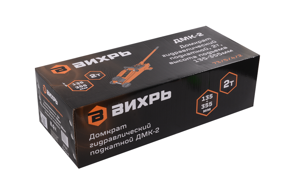 Модель автомобильного домкрата Вихрь ДМК-2 относится к категории гидравлических подкатных домкратов с ручным приводом, может применяться как в условиях профессиональных СТО и, так и в частных гаражах. Домкрат позволяет плавно поднимать грузы весом до 2 т на высоту до 355 мм, прилагая небольшие усилия, и с последующей их фиксацией на заданной высоте. В конструкцию домкрата входит рама, опорная основа, колёса, подъёмный рычаг, запорный клапан, рукоятка и ручка для переноски. Высота подхвата – 135 мм. Вес домкрата – 9.55 кг.