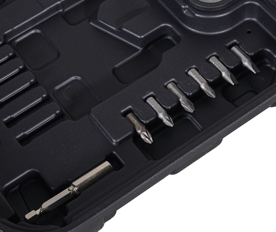 В комплете с шуруповертом идет кейс для хранения и транспортировки. В кейсе удобно хранить второй аккумулятор и зарядное устройство. Также есть место для размещения остастки.