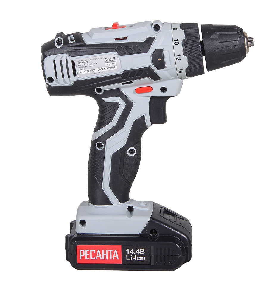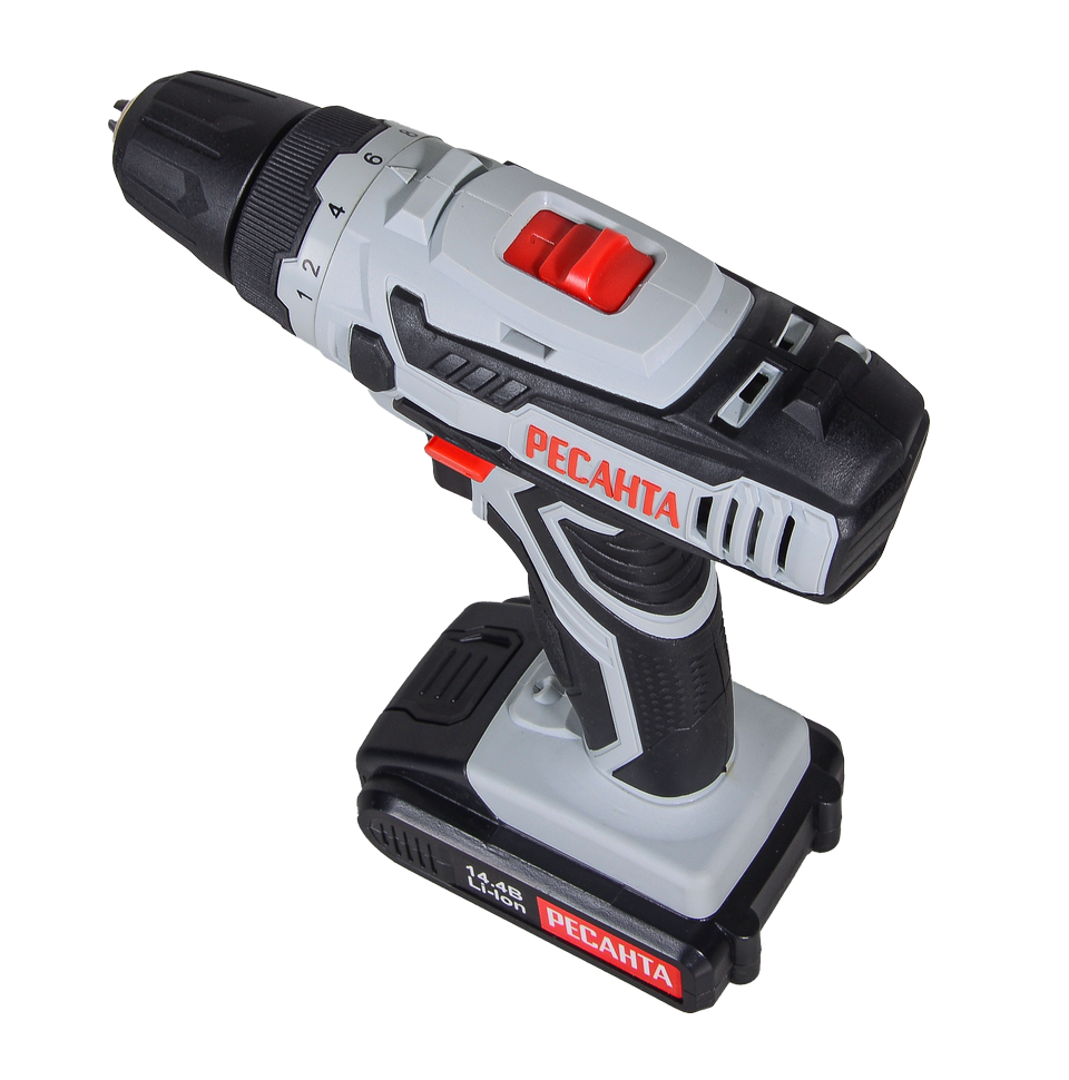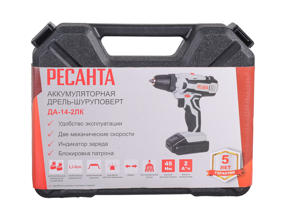 Дрель-шуруповерт Ресанта ДА-14-2ЛК с двумя сменными литий-ионными аккумуляторами обладает высоким крутящим моментом 45/23 Н*м. Инструмент упакован в пластиковый кейс с отсеками для зарядного блока, аккумуляторов, бит и сверл.