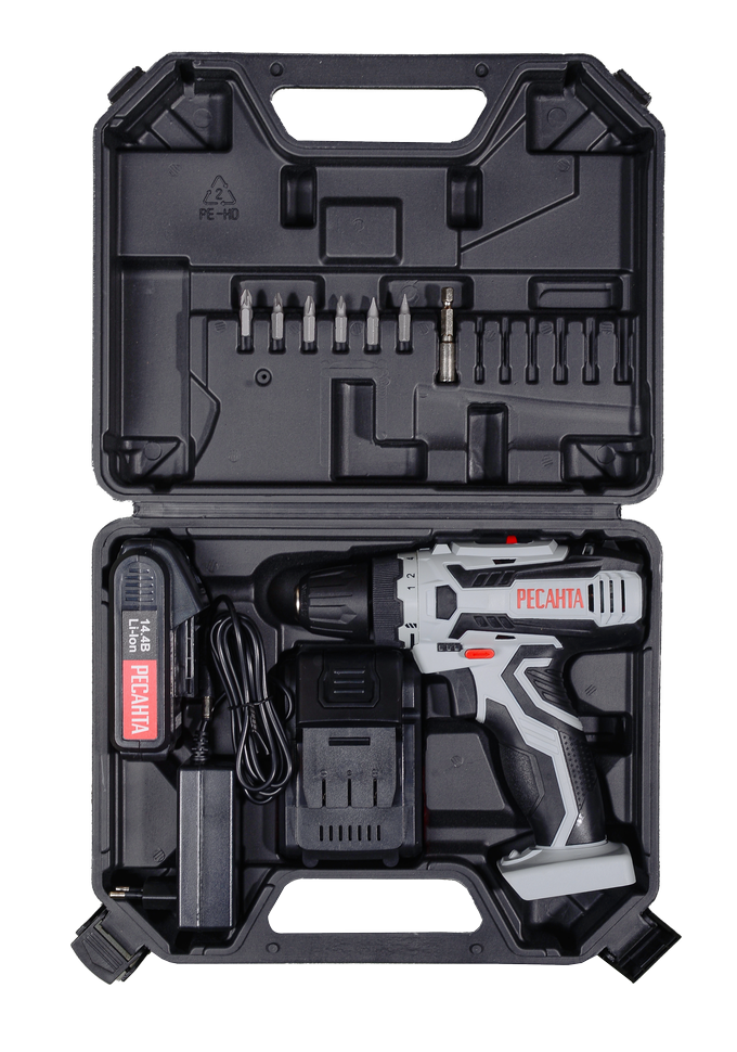 В комплект поставки входят дрель-шуруповерт Ресанта ДА-14-2ЛК, паспорт, 2 аккумуляторных батареи и зарядное устройство, 6 бит и 1 адаптер-удлинитель для них, пластиковый кейс.