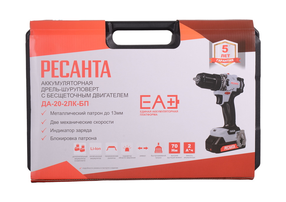 Модель Ресанта ДА-20-2ЛК-БП (2,0 А/ч) оснащена двумя аккумуляторами Li-ion с емкостью 2,0 А·ч каждый, что обеспечивает длительную работу без необходимости частой подзарядки. Рабочее напряжение составляет 20 В.