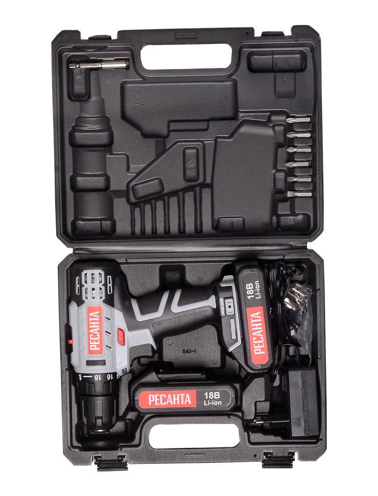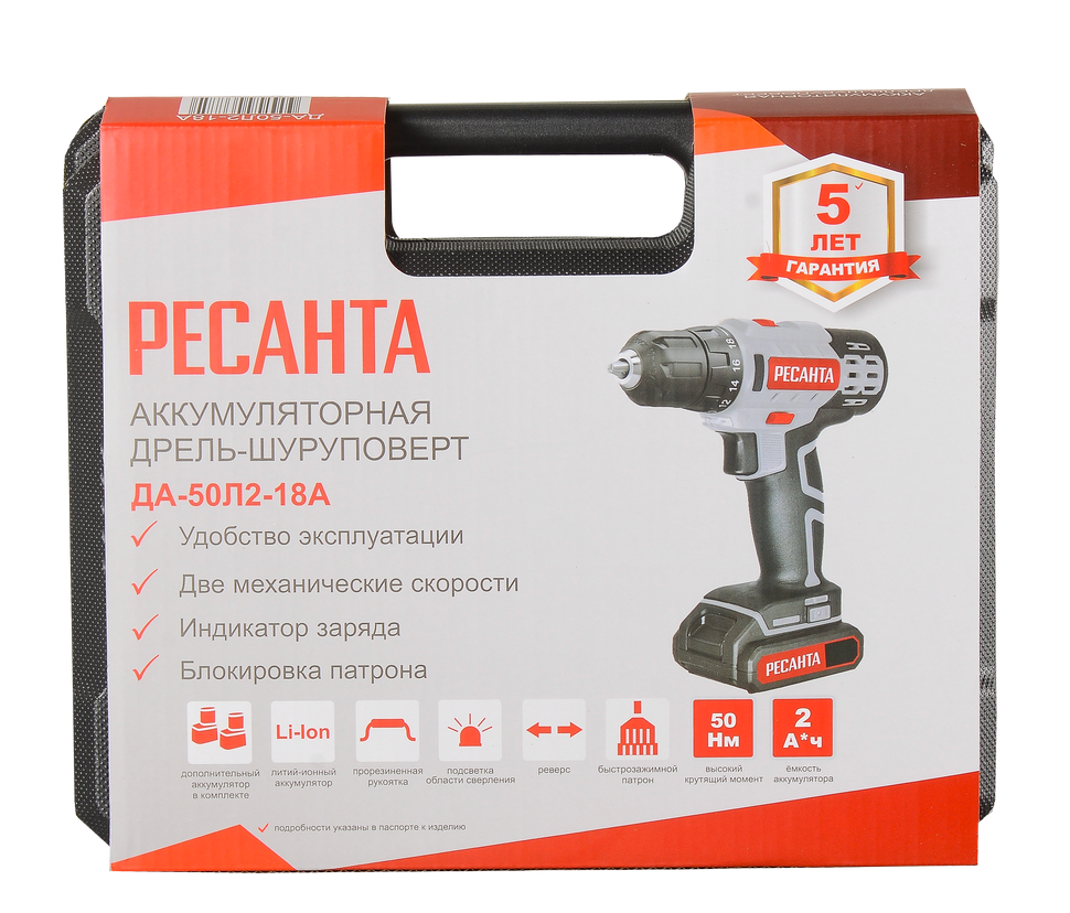 Дрель-шуруповерт Ресанта ДА-50Л2-18А имеет 2 аккумулятора емкостью 2 А*ч с напряжением 18 В. Щеточный тип двигателя обеспечивает высокую производительность с максимальным вращающим моментом 50/25 Нм. Быстрозажимной патрон диаметром 0,8-10 мм в сочетании с функцией блокировки шпинделя обеспечивает удобную замену оснастки. Аккумуляторные батареи типа Li-ion отличаются быстрой зарядкой в течение 60 мин. Наличие двух режимов работы со скоростью вращения 0-400 и 0-1400 об/мин позволяет подстраиваться под используемый в работе материал и его толщину. Максимальный диаметр отверстий для древесины составляет 30 мм, для металла - 12 мм.