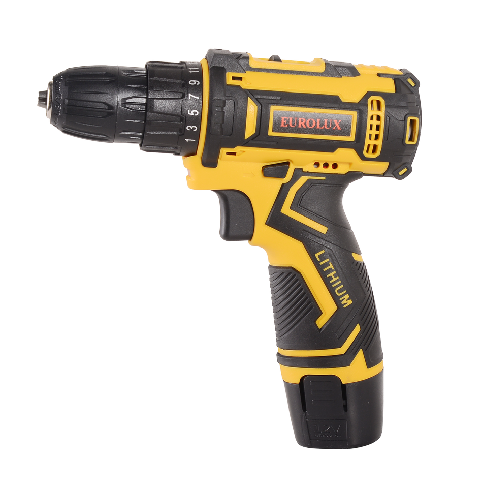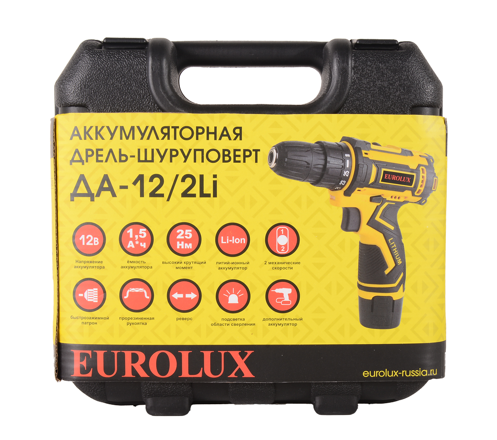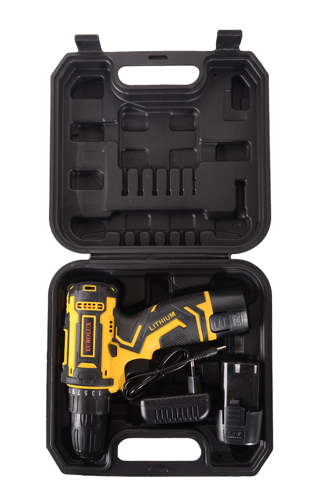 Дрель-шуруповерт EUROLUX ДА-12/2Li – это компактный инструмент, который может использоваться для закручивания шурупов и саморезов, сверления разных видов материалов (металла, пластика, дерева пр.). Благодаря наличию реверса, также подходит для выкручивания метизов. Работает от литий-ионного аккумулятора емкостью 1,5 Ач. В комплекте также имеется запасной аккумулятор, который позволяет непрерывно использовать инструмент. Пока одна батарея эксплуатируется, вторая стоит на зарядке. Среди преимуществ инструмента стоит отметить его автономность, ведь он хорошо подходит для проведения работ в местах, где нет поблизости розетки.