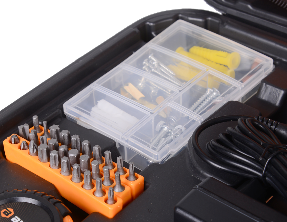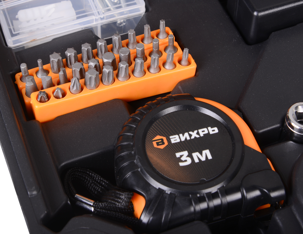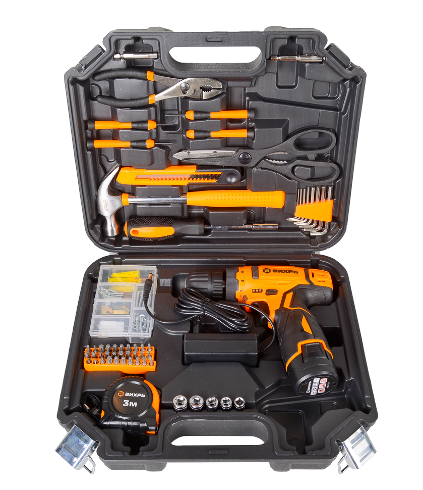 Дрель-шуруповерт ВИХРЬ ДА-12Л-2КН поставляется в комплекте с целым набором инструментов для выполнения строительно-ремонтных работ.