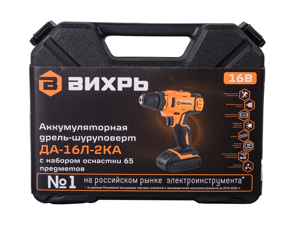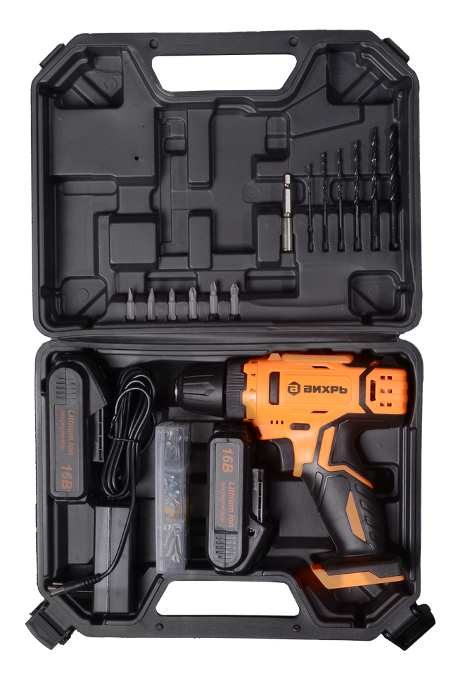 Дрель-шуруповерт Вихрь ДА-16Л-2КА станет прекрасным помощником как профессиональному строителю, так и хорошему хозяину. Устройство поставляется в удобном кейсе с набором оснастки из 65 предметов. Не нужно бегать по магазинам в поисках биты, она уже есть в кейсе с шуруповертом.