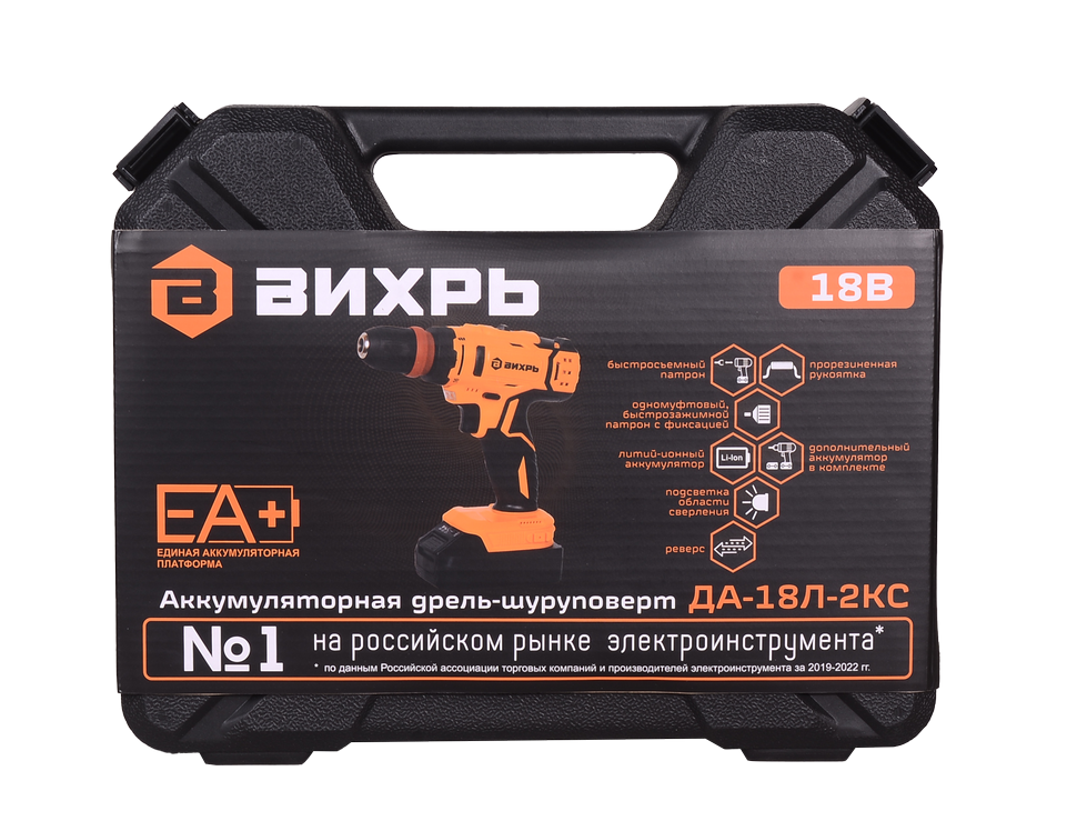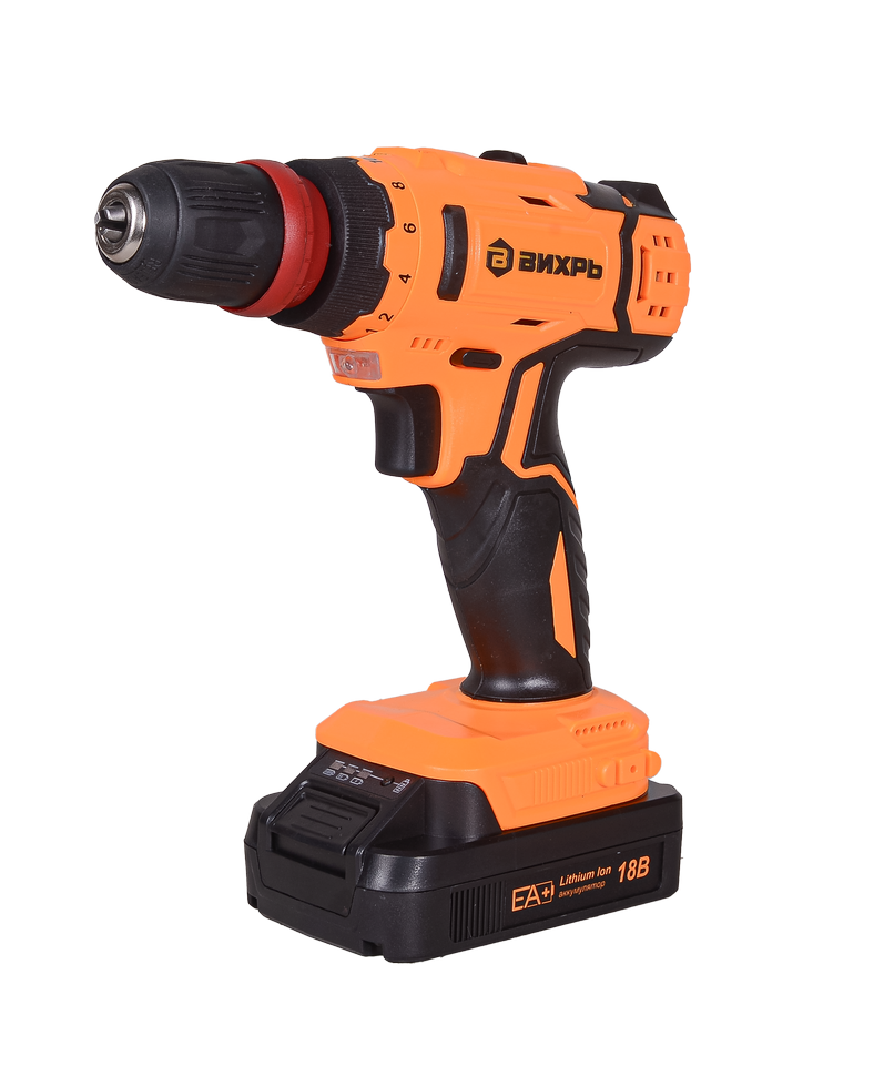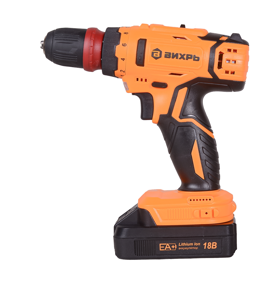 Дрель-шуруповерт ВИХРЬ ДА-18Л-2КС будет полезен при необходимости сверления отверстий, установке крепежа.