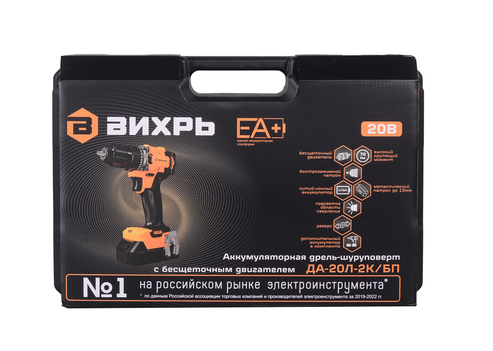 Крутящий момент в 70 Нм позволяет легко закручивать крепежи даже в твердые материалы. У аккумуляторной дрели-шуруповерта две скорости вращения (от 0 до 1850 об/мин), что дает возможность выбрать оптимальный режим для конкретного материала. Вихрь ДА-20Л-2К/БП (2,0 А/ч) оснащен удобными функциями, такими как реверс, подсветка рабочей зоны, блокировка шпинделя. Для удобства переноски предусмотрен кейс, в комплекте поставляется набор бит и сверла.
