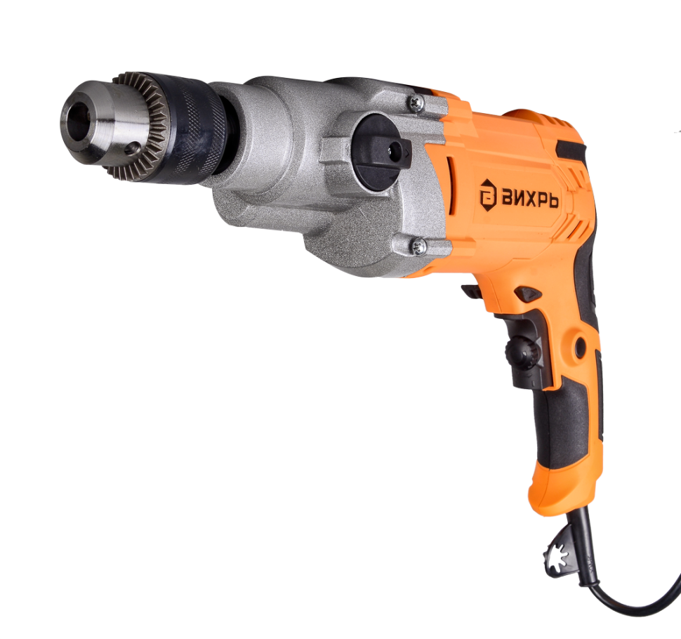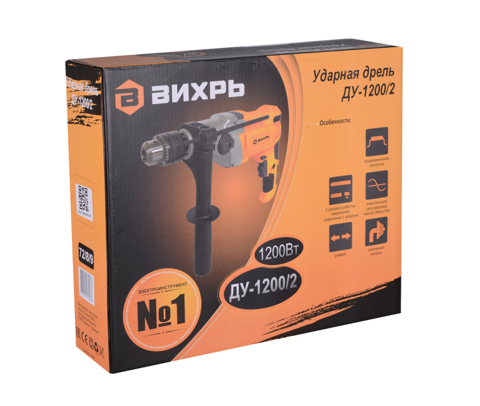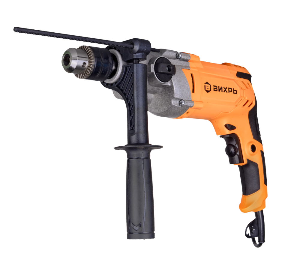 Дрель Вихрь ДУ-1200/2 получила реверс исключающий застревание сверла в материале, систему регулирования оборотов, дополнительную рукоятку и механизм фиксации кнопки включения. Внутренние детали дрели расположены в прочном металлическом корпусе. Универсальность инструмента состоит в том, что дрель можно использовать в качестве шуруповёрта, а также как миксер для смешивания лакокрасочных материалов. Соответствующие насадки в комплект не входят. Вес инструмента – 3 кг.