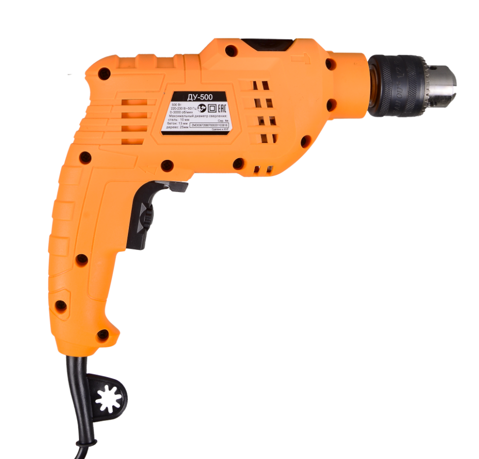 Компактная ударная дрель модели Вихрь ДУ-500 – строительный электроинструмент, который предназначен для создания отверстий в материалах разной твердости: стали и других металлах, древесине и бетоне. Максимальный диаметр сверления этих материалов составляет 10,25 и 13 мм соответственно. Электродрель незаменима при ремонте в частных домах и квартирах, поскольку позволяет не только сверлить отверстия, но и быстро закручивать винты и шурупы, а также выкручивать их при демонтаже мебели и других конструкций. Такую возможность обеспечивает реверсивный режим вращения сверла. Частота вращения составляет до 3000 оборотов в минуту.