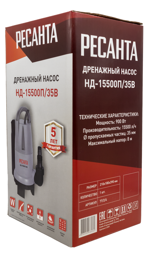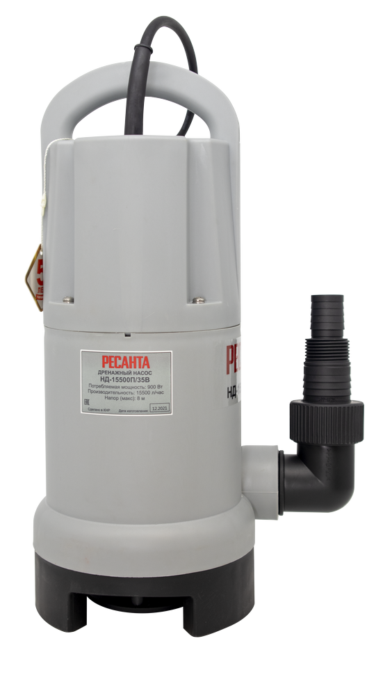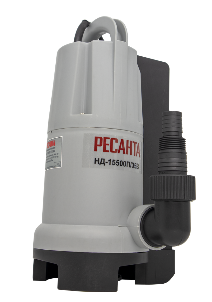 Корпус насоса Ресанта НД-15500П/35В изготовлен из пластика. Устройство комплектуется асинхронным двигателем мощностью 900 Вт, который перекачивает до 258 л/мин. Насос имеет степень защиты IPX8. Это служит доказательством того, что он может длительное время работать при полном погружении в воду. Дренажный насос данной модели имеет встроенный поплавок, который обеспечивает удобное применение в узких емкостях, например, бочке. Вручную при желании можно откачать воду практически полностью. Также устройство оснащено поплавковой системой включения, которая срабатывает автоматически и предупреждает работу устройства на сухом ходу, тем самым, исключая его преждевременный выход из строя. Кабель поплавка можно изменять, что позволяет настроить его работу на нужной глубине.