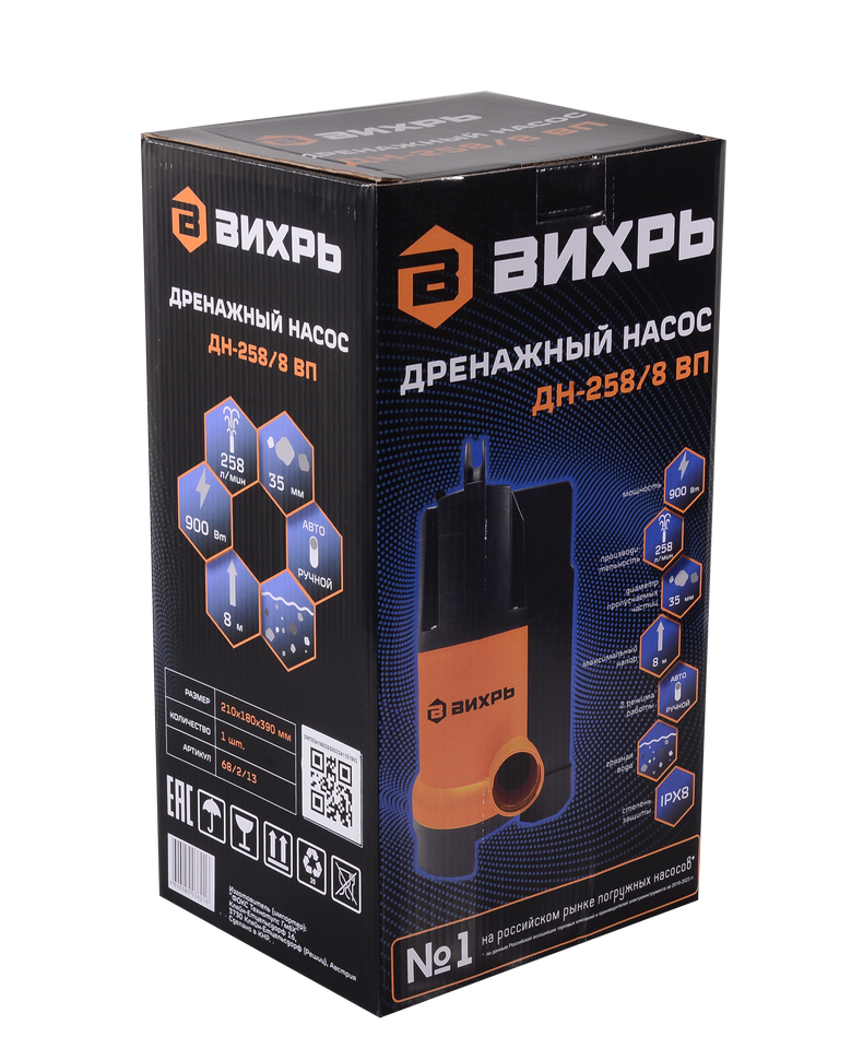 Модель оснащена автоматической поплавковой системой включения. При недостатке воды насос прекращает подачу для сохранения работоспособности. Вихрь ДН-258/8 ВП приспособлен к функционированию в ограниченных пространствах, например бак на даче или бочка. Ручной режим позволяет практически полностью осушить пространство.