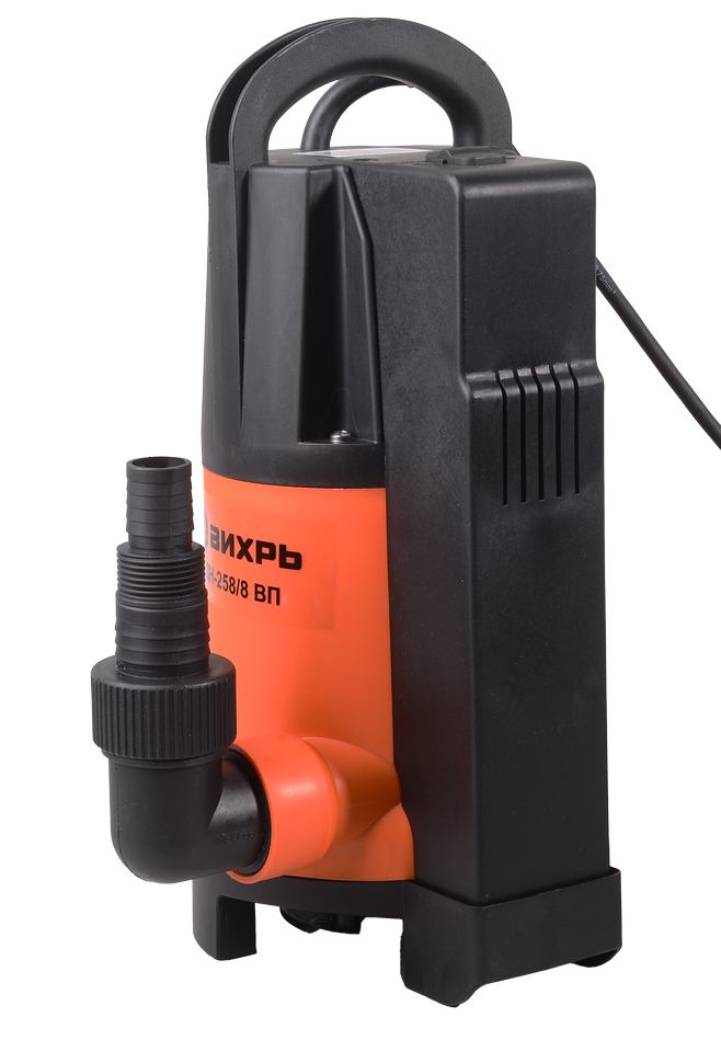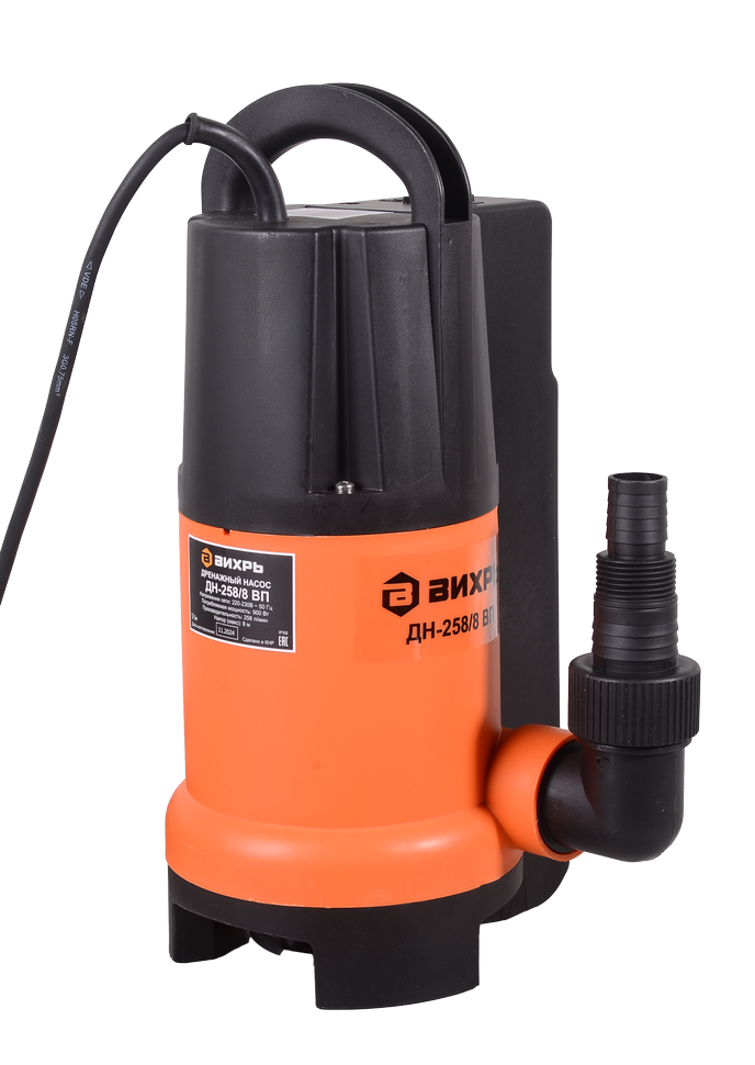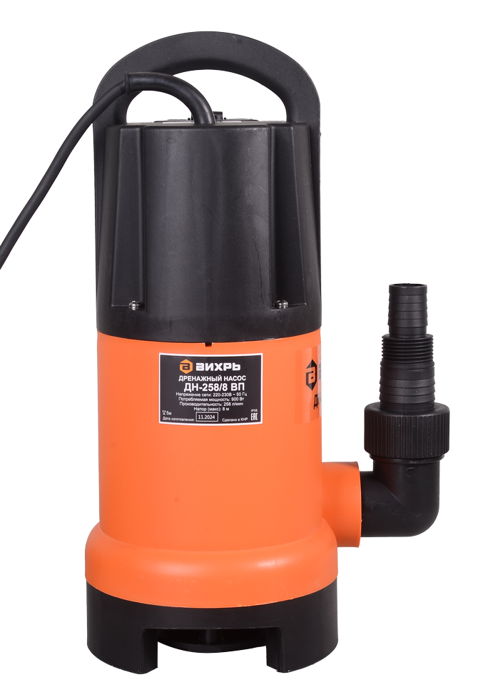 Мощность насоса составляет 900 Вт. Максимальное количество включений насоса за час - 20. Вихрь ДН-258/8 ВП оснащен двигателем асинхронного типа, ротор короткозамкнутый имеет одну фазу. Корпус выполнен из пластика для предотвращения коррозийных процессов.