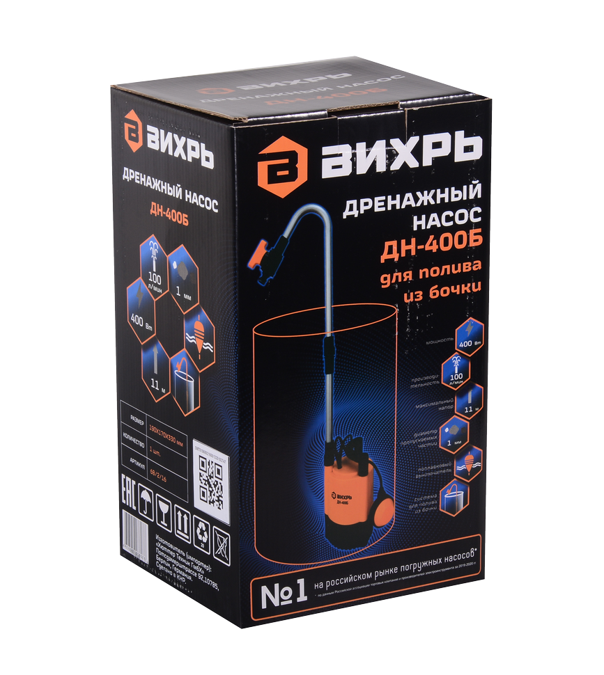 Дренажный насос Вихрь ДН-400Б предназначен для откачивания и отведения чистой воды. Насос рассчитан на 20 включений за час. Насосы этой серии оснащаются асинхронными однофазными электрическими двигателями, которые отличаются надёжностью и не требуют технического обслуживания. Мощность двигателя – 400 Вт. Максимальная водоподача – 100 л/мин. Напор – до 11 м. Допустимая глубина погружения – 7 м. Диаметр пропускаемых частиц – не более 1 мм. Выходное отверстие – 3⁄4". Модель может применяться для откачивания воды из подвалов, а также для поднятия её из колодцев.
