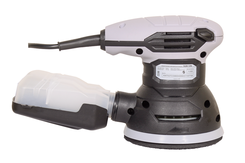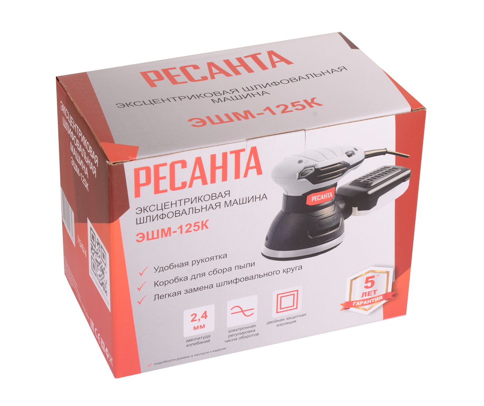 Шлифмашина Ресанта ЭШМ-125К состоит из пластикового корпуса, внутри которого находится электромотор с номинальной мощностью 300 Вт. Он обеспечивает вращение круглой подошвы через передаточный механизм. Особенность инструмента заключается в том, что подошва вращается по орбите и вокруг своей оси, благодаря чему достигается отменный результат шлифовки. Скорость вращения легко регулируется интенсивностью нажатия кнопки включения. Частота вращений составляет от 4 000 до 14 000 об/мин. Эксцентриковая шлифовальная машина отличается высокой эффективностью, так как имеет увеличенную амплитуду колебаний - 2,4 мм. Для удобства эксплуатации предусмотрены технологические отверстия для вентиляции. Инструмент оснащен пылесборником и удобной дополнительной рукоятью. Абразивные круги диаметром 125 мм крепятся на липкой основе за считанные секунды.