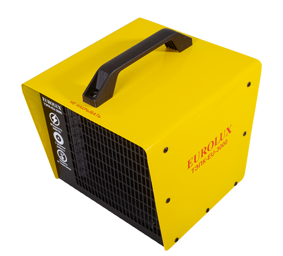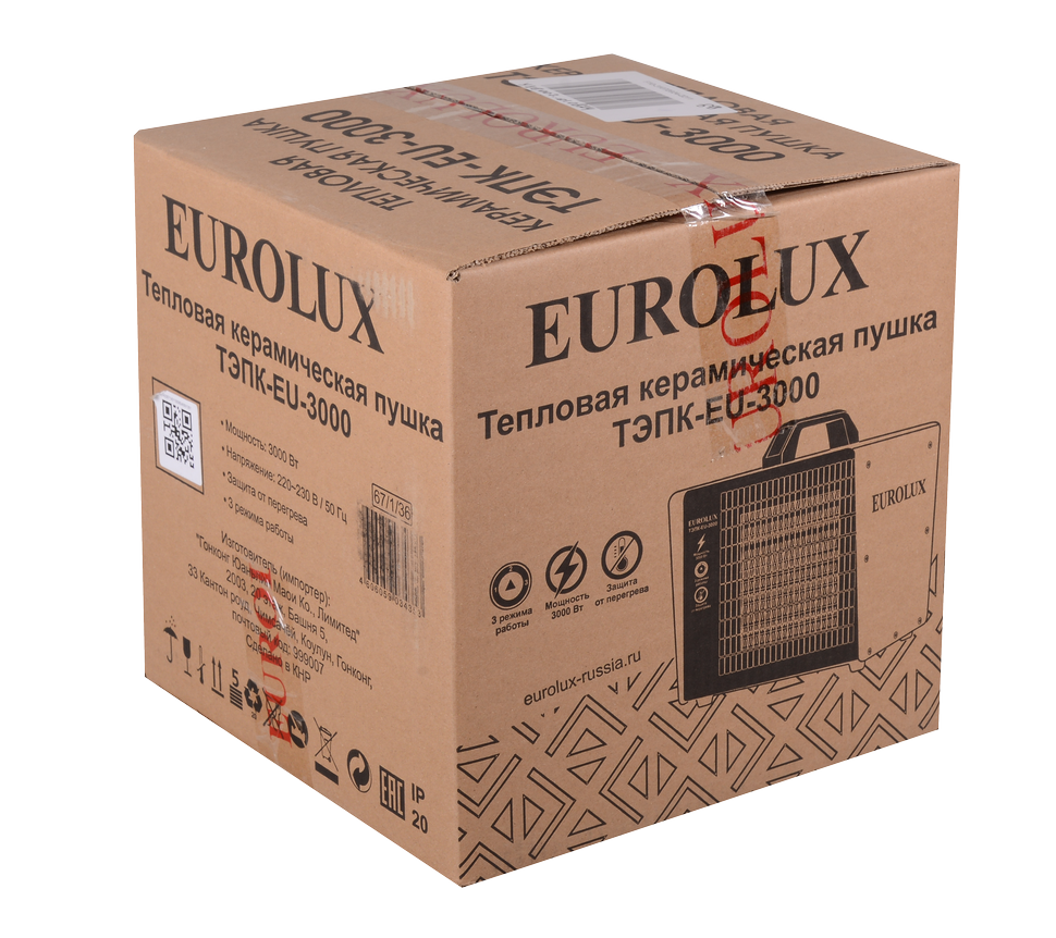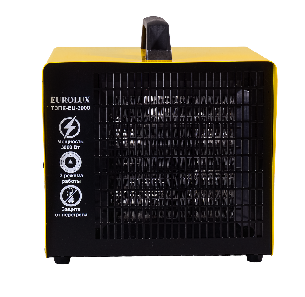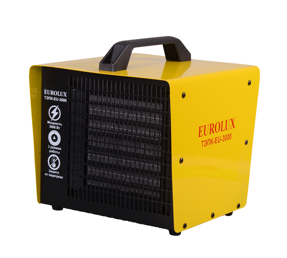 Корпус тепловой пушки металлический, имеет квадратную форму и перфорированную решётку. Сверху имеется удобная пластиковая ручка. Органы управления в виде переключателей режимов работы и регулятора оборотов вентилятора вынесены на тыльную сторону. Установка модели Eurolux ТЭПК-EU-3000 напольная. Для исключения скольжения по напольным покрытиям предусмотрены ножки. Электрическая тепловая пушка работает от бытовой сети 220 В, 50 Гц.