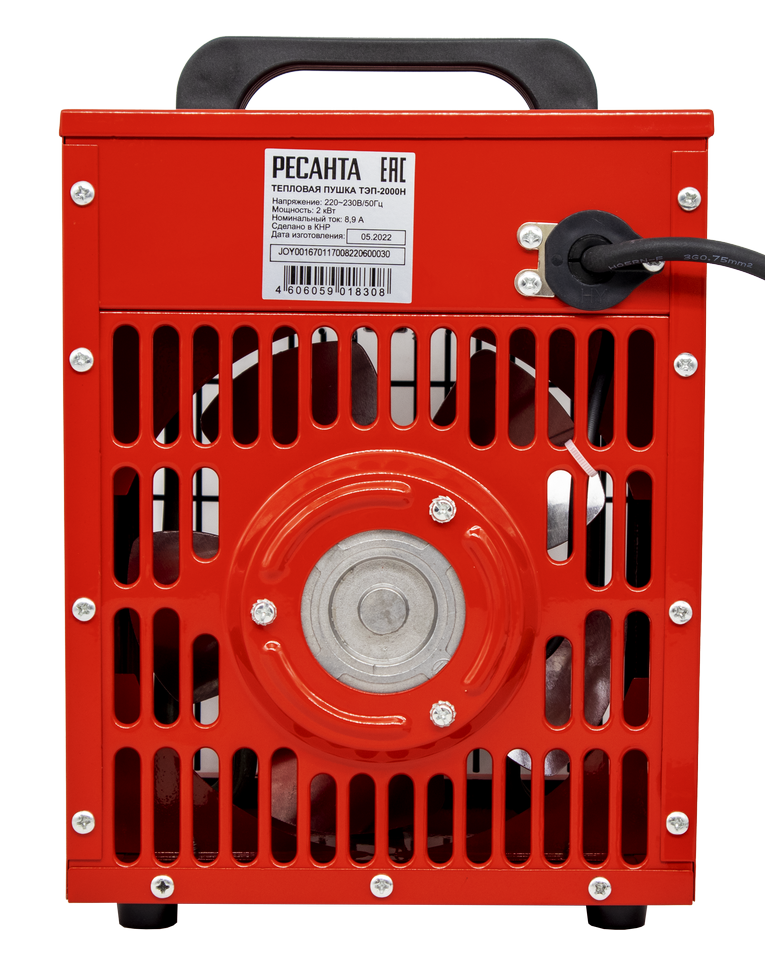 Тепловая пушка способна быстро набирать заданную при помощи терморегулятора температуру, благодаря трубчатому нагревательному элементу. Производитель предусмотрел три режима работы – вентиляции без обогрева, нагрев на половину мощности – 1000Вт, и в полную мощность – 2000 Вт. Подключается к электросети через евровилку.