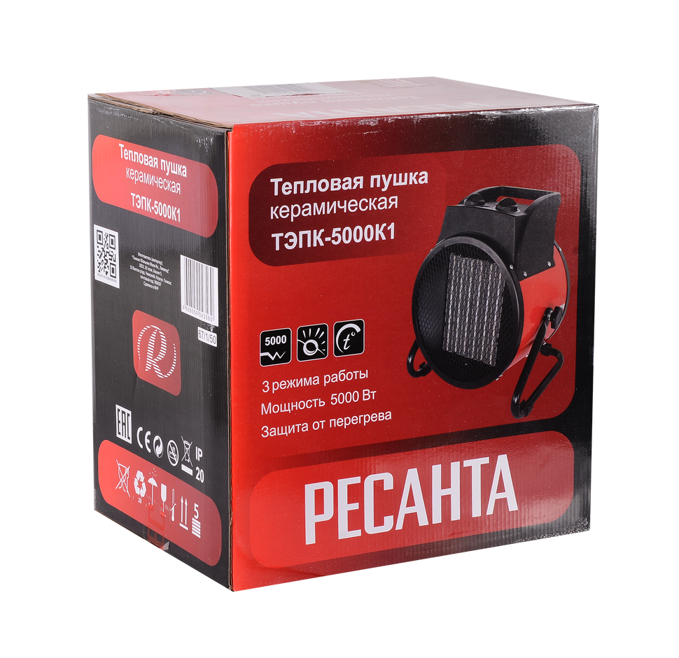 Электрическая тепловая пушка РЕСАНТА ТЭПК-5000K1 используется для вентиляции и быстрого нагрева воздуха в производственных, складских и жилых помещениях. Максимальная тепловая мощность 5 кВт позволяет эффективно обогревать закрытое пространство площадью до 50 м². С помощью вентилятора поток воздуха 400 м³/ч проходит сквозь керамический нагревательный элемент и равномерно распределяется. Электрическая теплопушка отличается экологичностью, не выделяет выхлопных газов и токсинов в процессе эксплуатации.