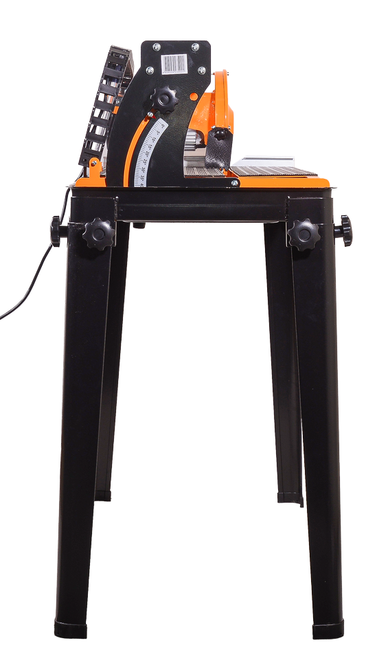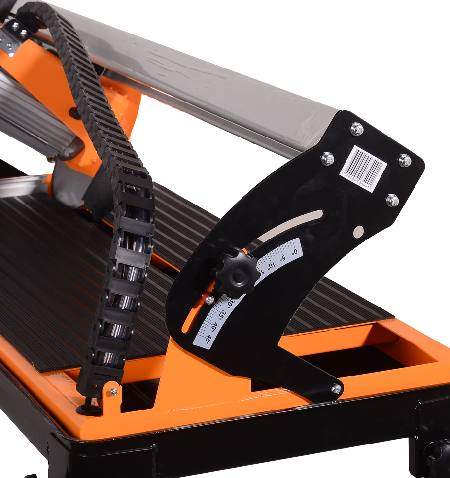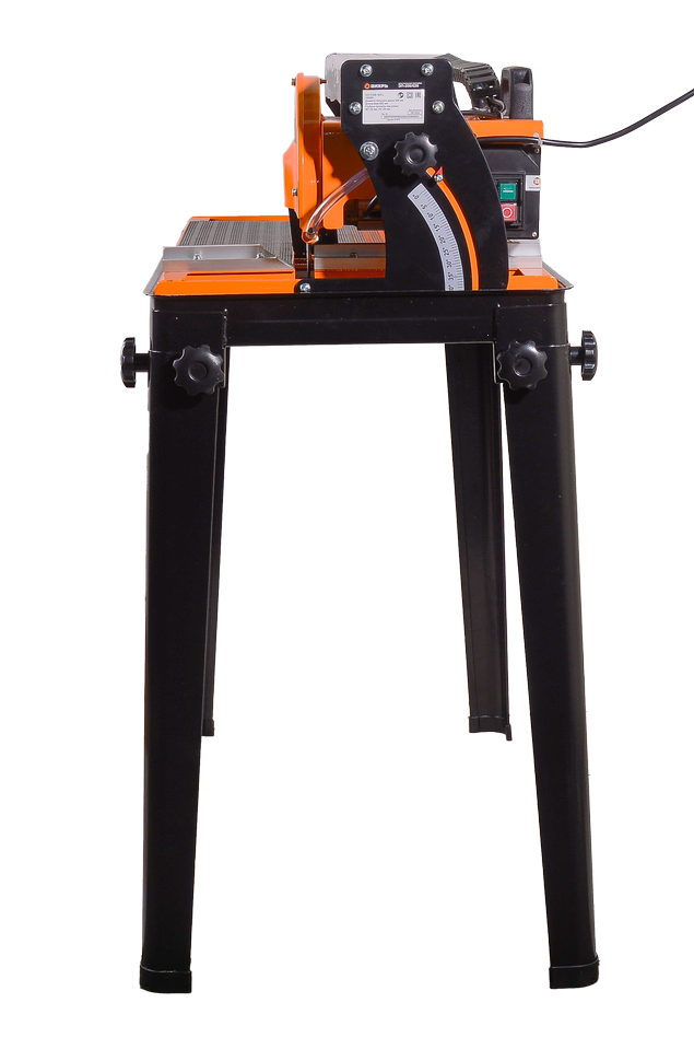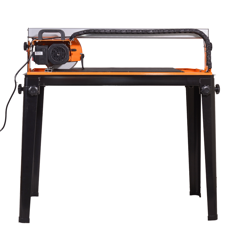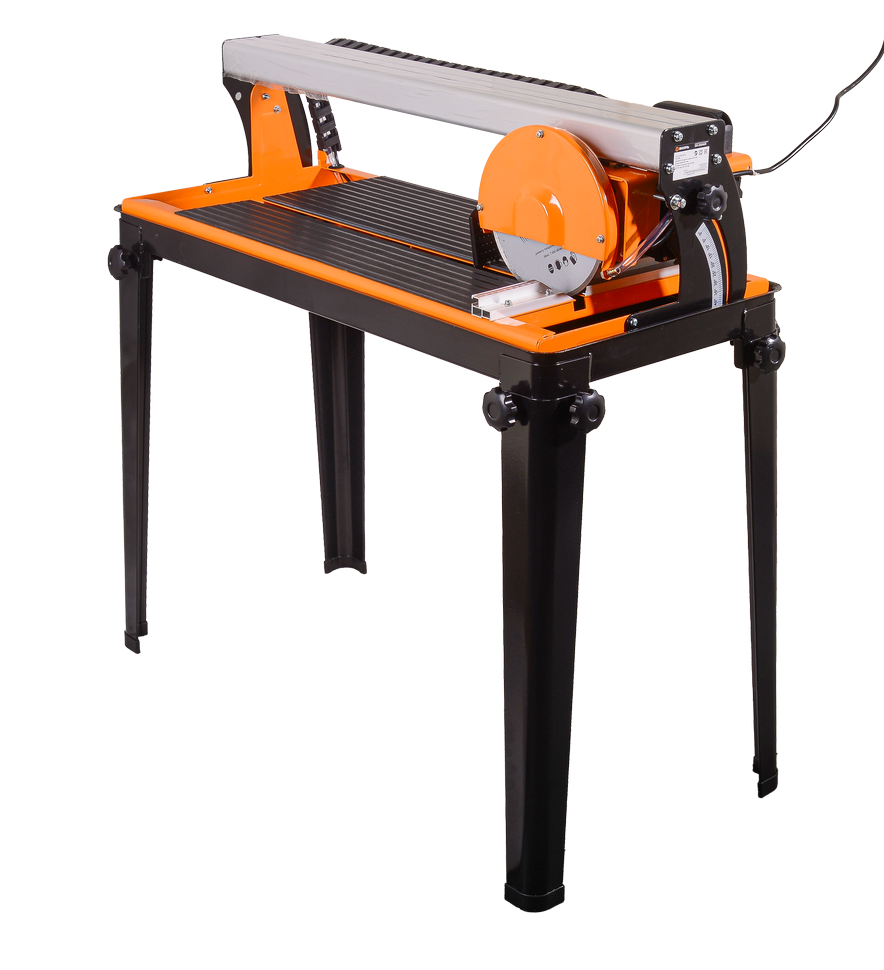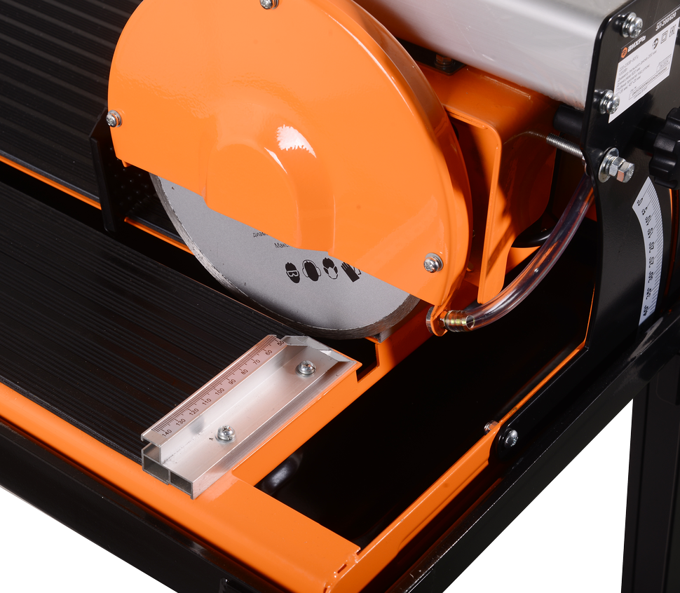 Режущей поверхностью является пильный диск 200 мм в диаметре. Он монтируется к посадочному отверстию стандартного размера 22,2 мм. Точность линии разреза обеспечивается надежностью подшипникового узла и подвижностью дисковой головки. Отсутствие протяжки плитки под диском делает процесс работы безопасным. Принудительная система охлаждения режущего элемента и используемого материала обеспечивается с помощью водяного насоса производительностью 600 л/ч. Подача воды к рабочей зоне снижает уровень пыли в процессе распиливания и минимизирует порчу плитки.